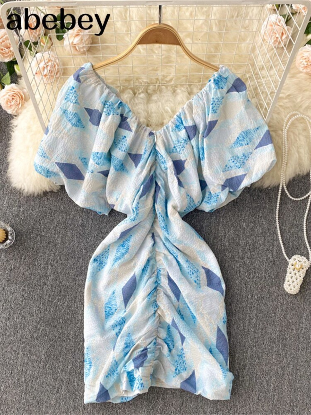 2022VカラープリーツバットウィングスリーブルーズドレスレディースプリントVestido Abe82086795064