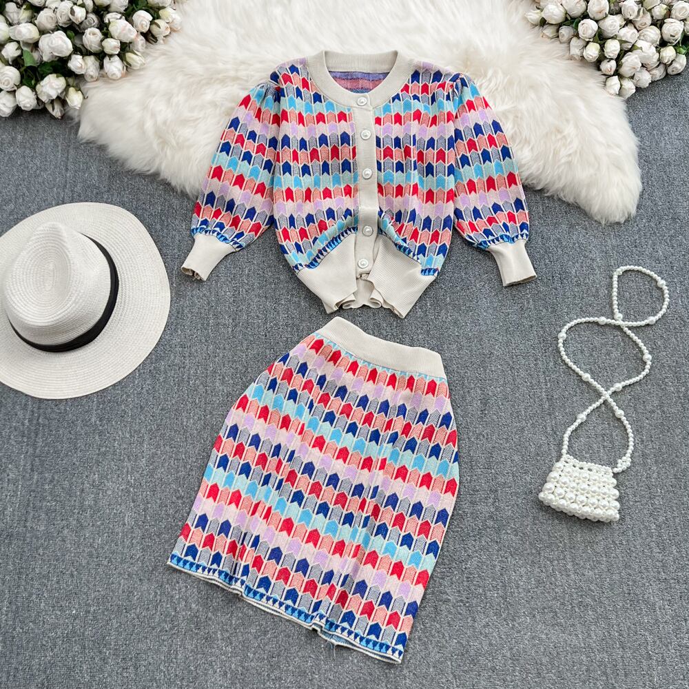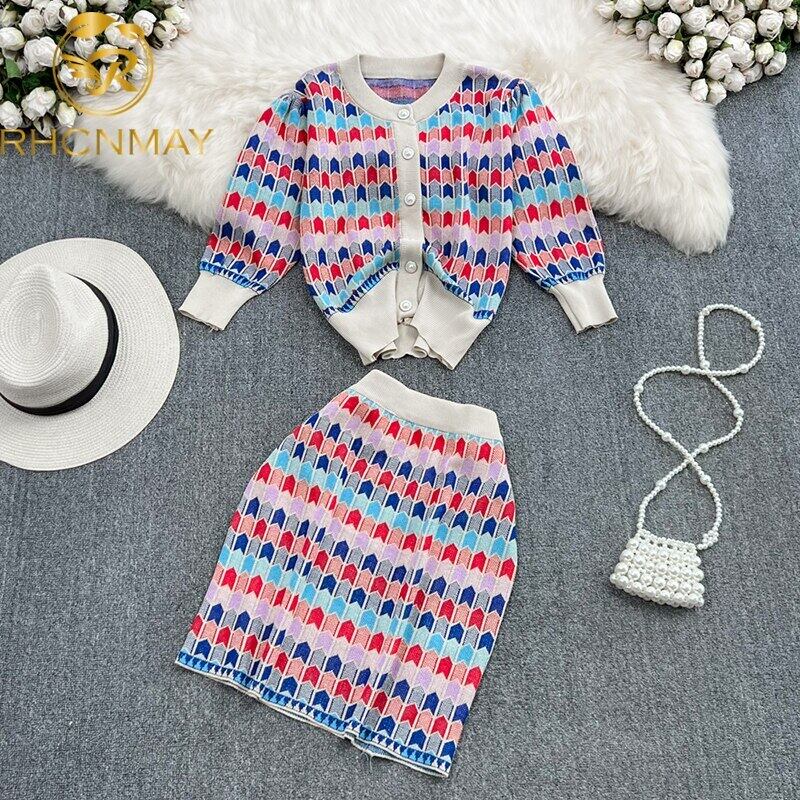 レディーススカートセット2022春夏レトロシングルブレストニットカーディガン+ウエストスカート2点セット スプリング 春物 サマー 夏物 Rhc64893081229