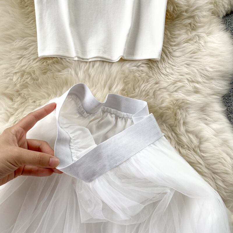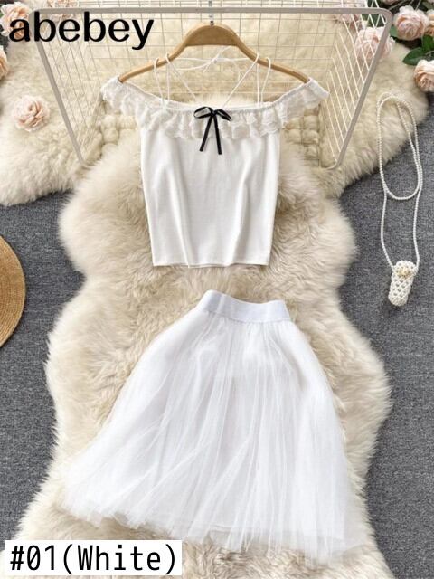 パーティークラブレディースサマーセット2022セクシースラッシュネックショートトップス伸縮性ウエストメッシュスカートツーピースセット エラスティック 夏物 Abe36263119636