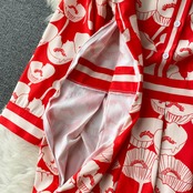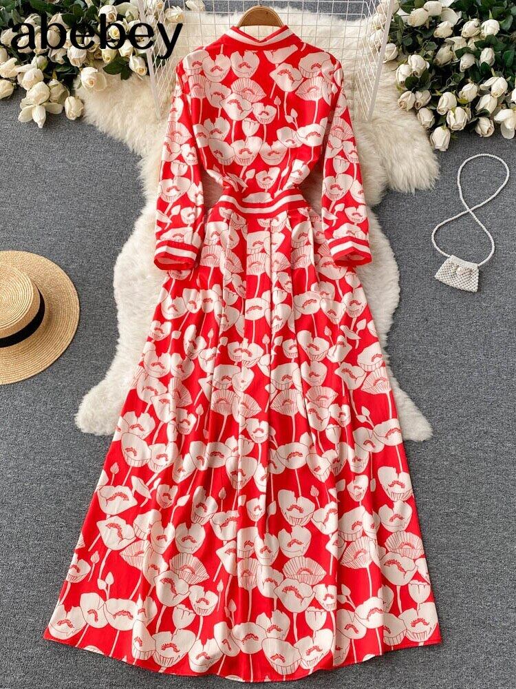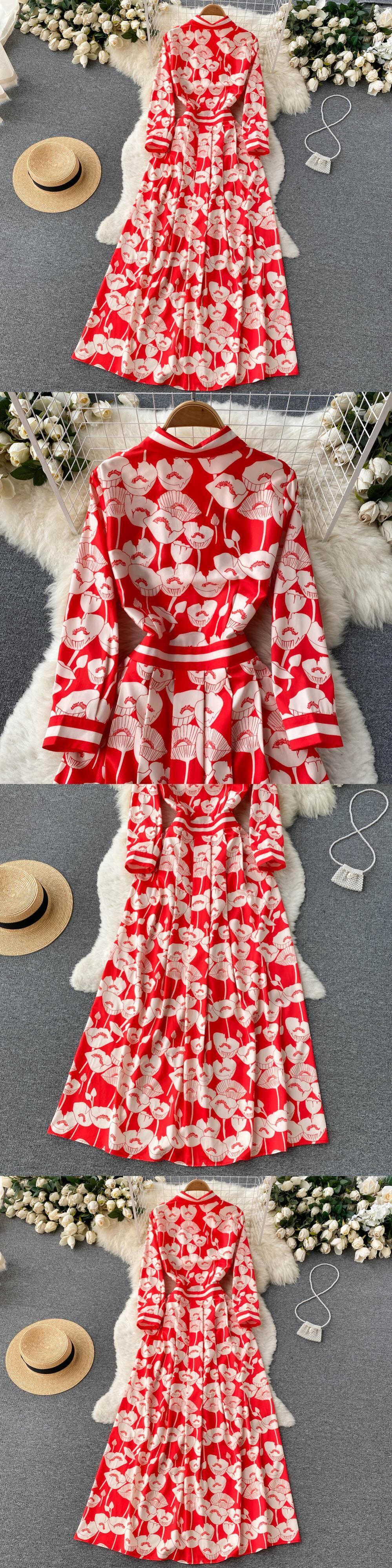 2022レッドターンダウンカラースタイルの女性のロングドレス夏のレトロなランタンスリーブフローラルシフォンプリントビーチマキシドレス サマー 夏物 花柄 Abe58199564765