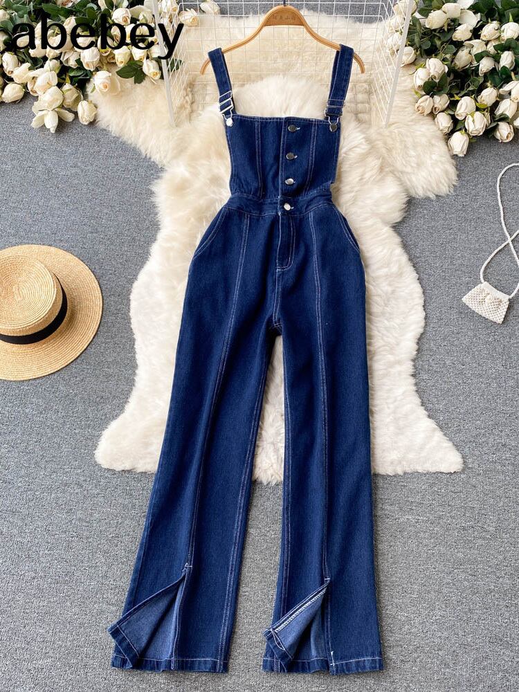 品質の女性ノースリーブデニムジャンプスーツ2022年夏ワイドレッグオーバーオールスタイルボタンバックレスロングロンパース サマー 夏物 ワイドパンツ Abe39636458728