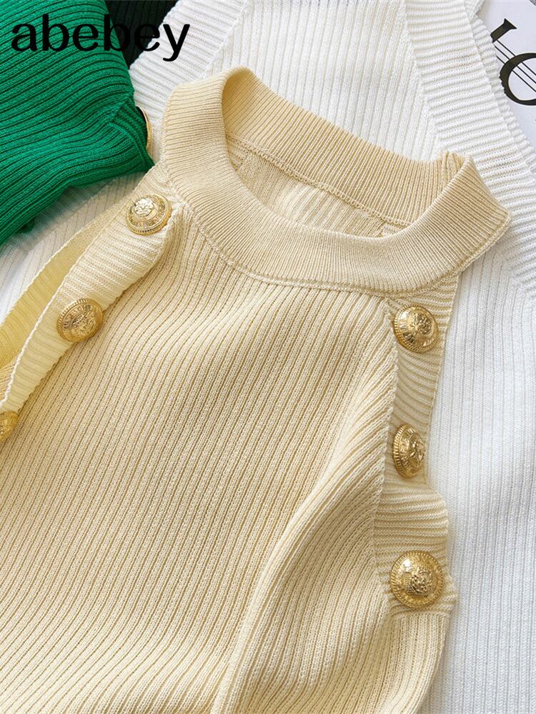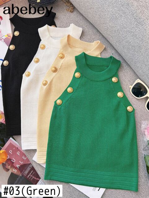 2022年夏の中空アウトレディースタンクトップ薄手のニットノースリーブセクシートップスゴールデンボタンキャミソールレディース服 サマー 夏物 Abe18563615714