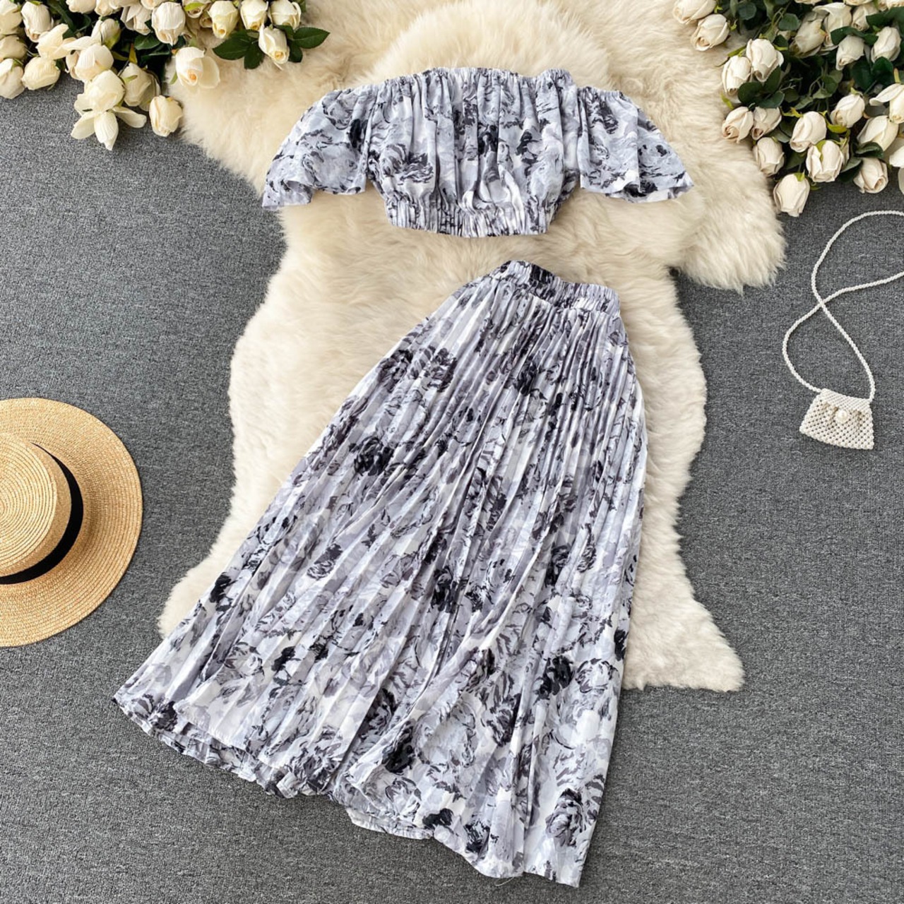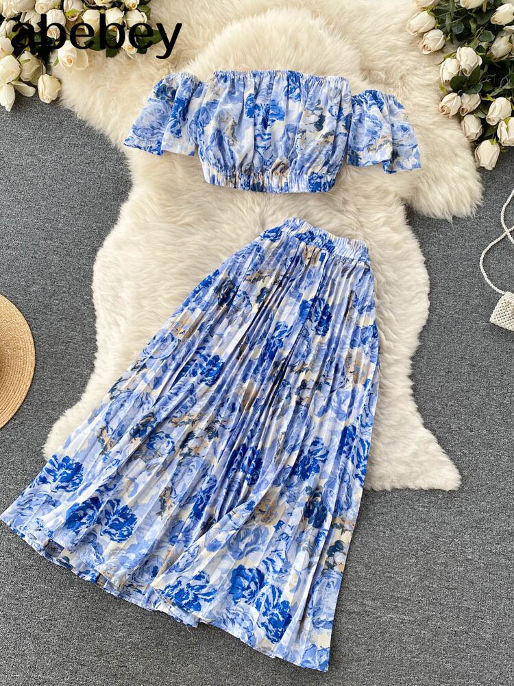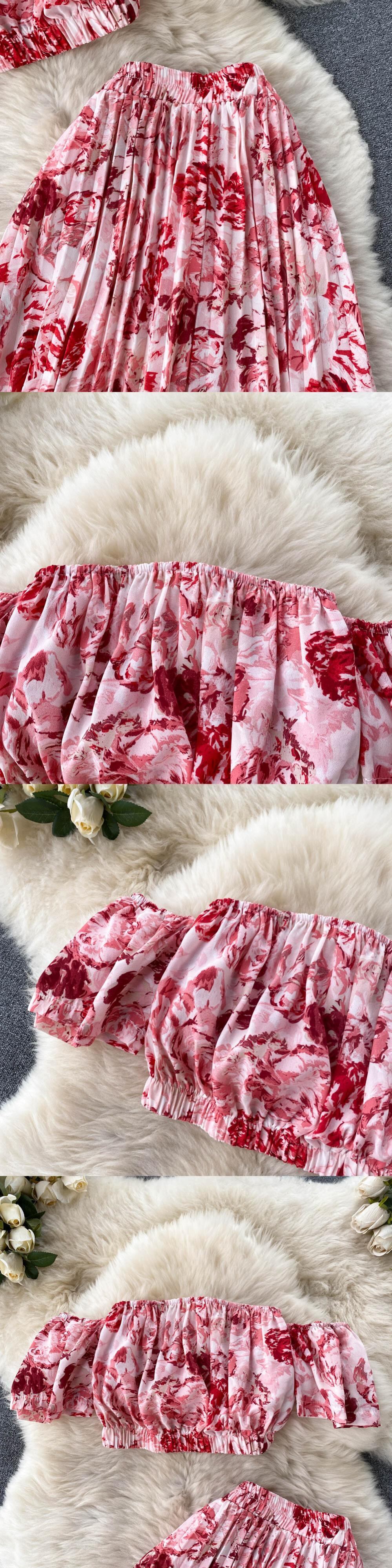 女性サマーフローラルツーピーススーツオフショルダーショートトップ+ウエストAラインロングスカートストリートウェアセット 夏物 花柄 Abe98928091617