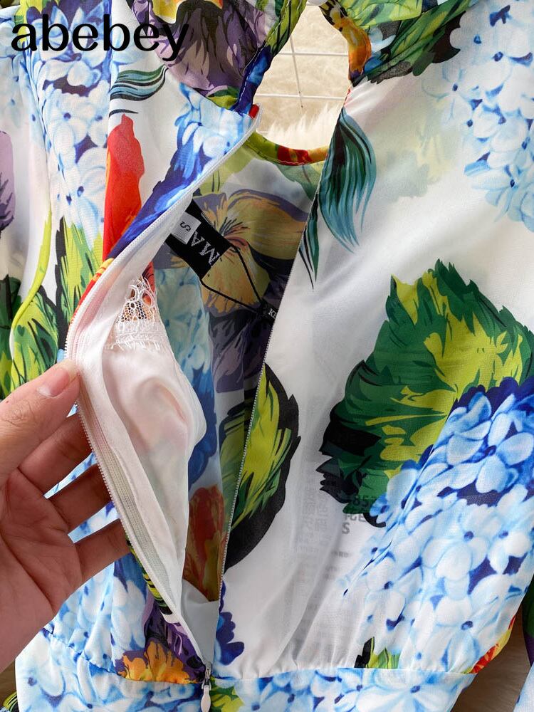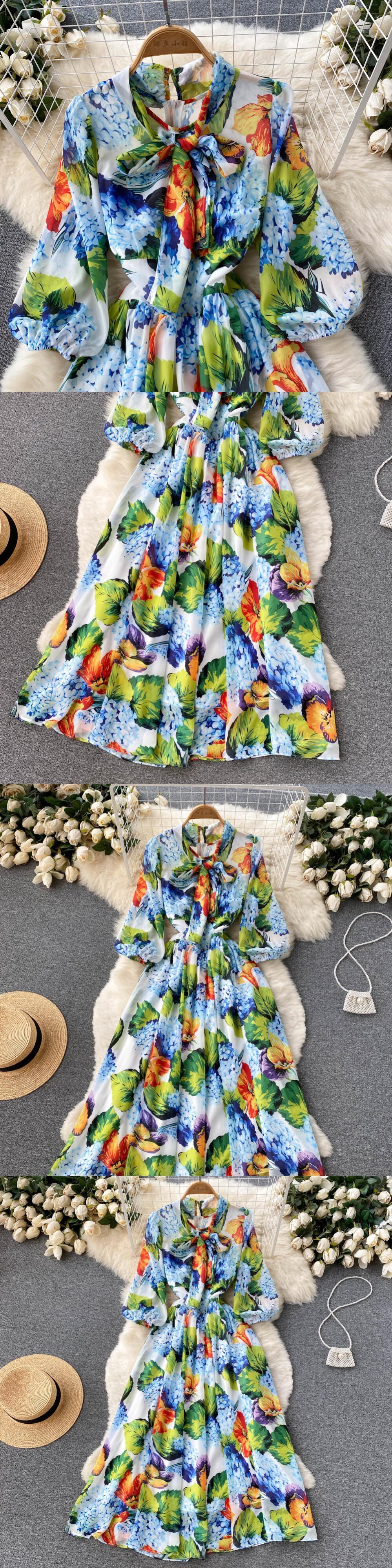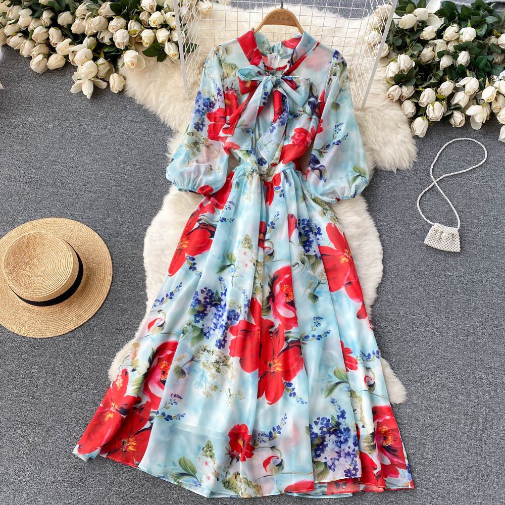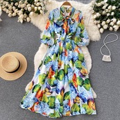 プリントレディースサマードレス2022ボウネックスリム半袖シングルブレストビーチAラインミディロングドレス ショート リボン ハーフスリーブ 夏物 Abe25842553518