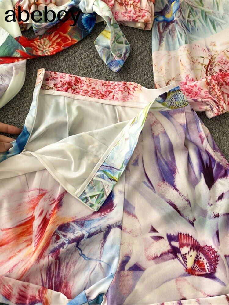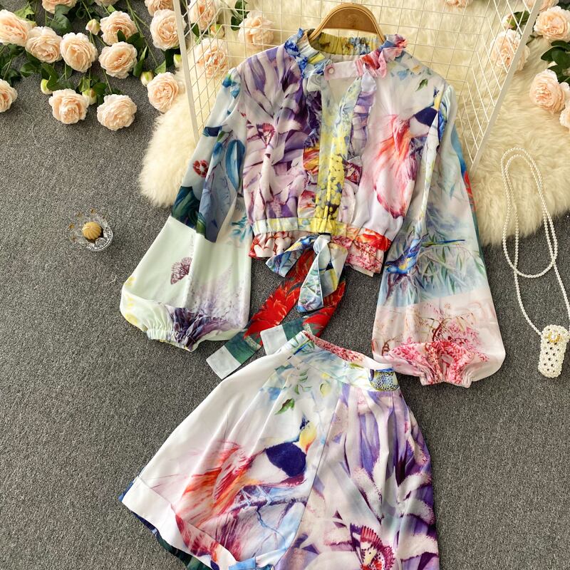 バケーションフローラルプリントセット女性2022年夏サッシランタンスリーブシングルブレストスリムツーピースセット サマー 夏物 Abe57557911800