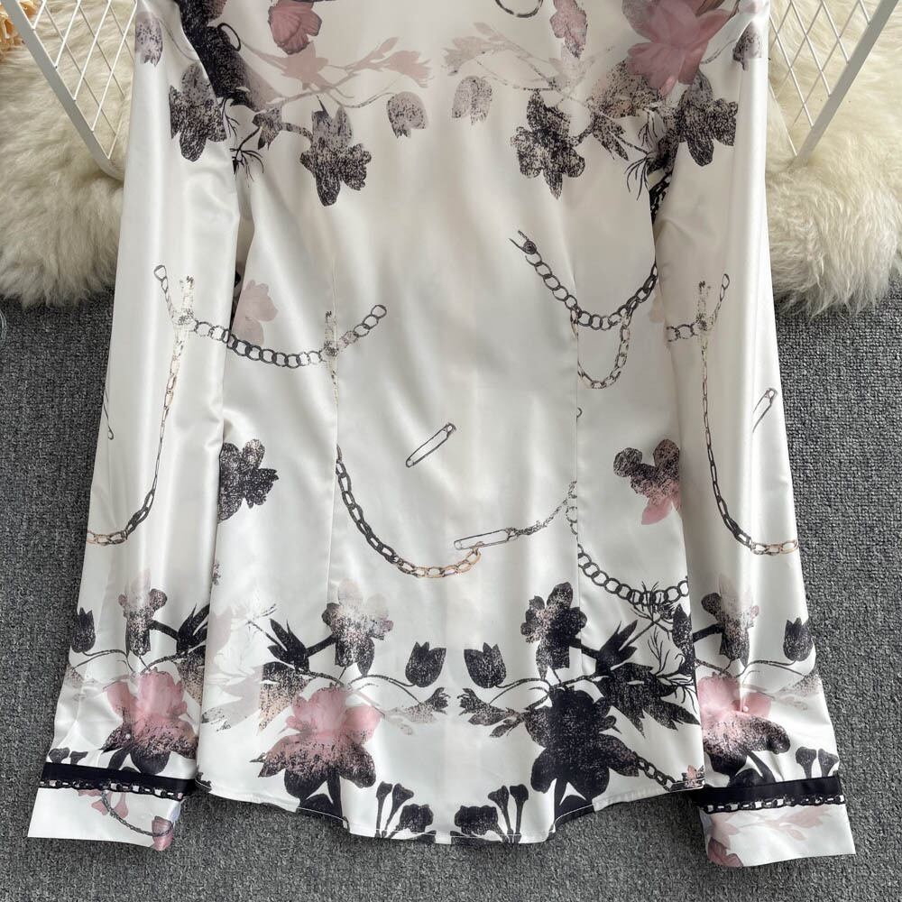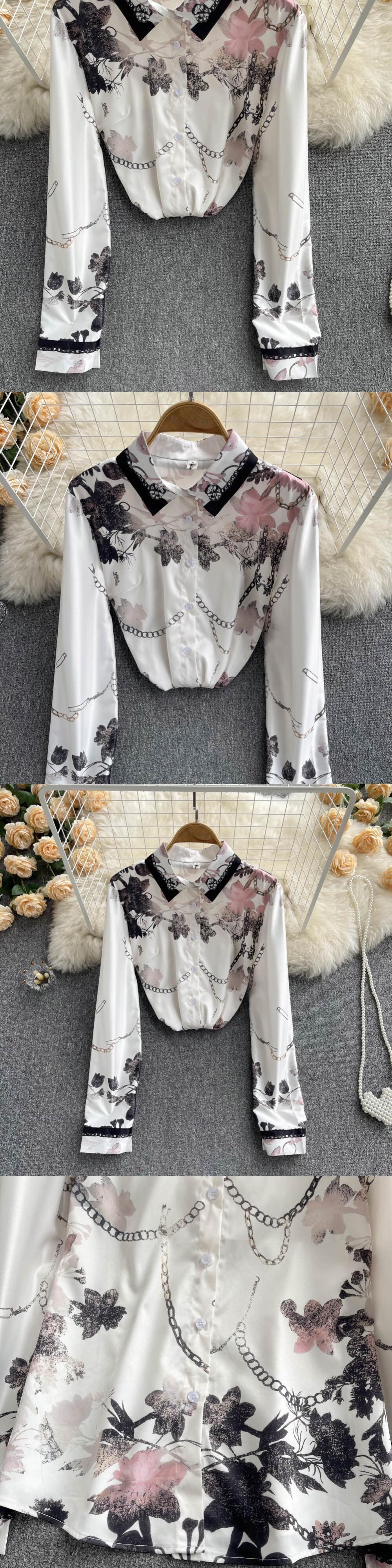 2022年女性フローラルシフォンブラウスサマーターンダウンカラーランタンスリーブトップスルーズプリントブラウス 夏物 花柄 Abe84113672869