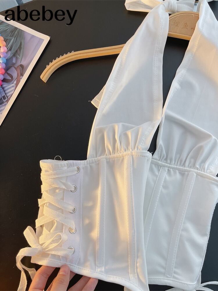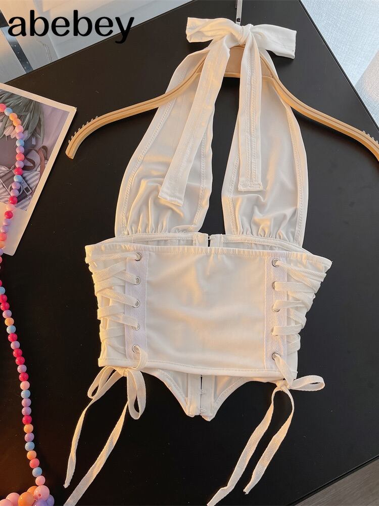 女性ストラップクロスオーバーフロントカットアウトホルターネックノースリーブバックレスクロップトップバンデージベスト夏セクシートップス女性服 サマー 夏物 Abe30034071381