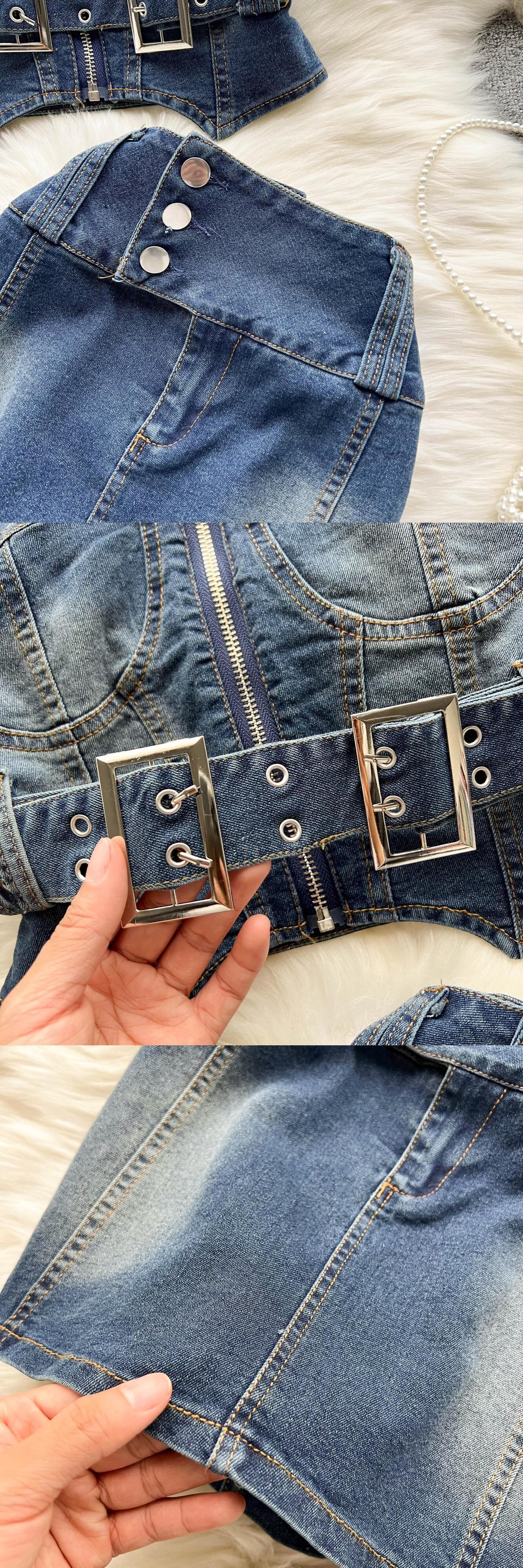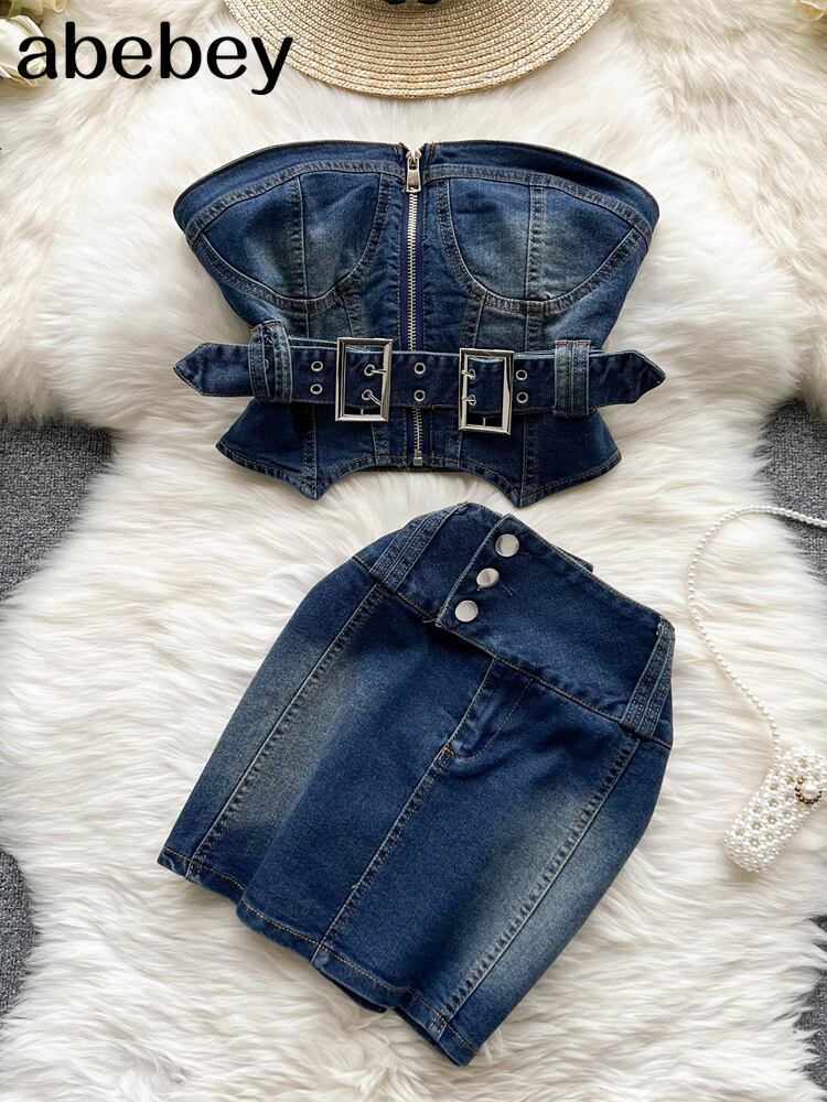 ベルトマッチングセットストラップリーキャミストップとスカート女性セクシーなスタイルへそ露出ショートエンパイアデニムツーピースセット ハーネス Abe79421378218