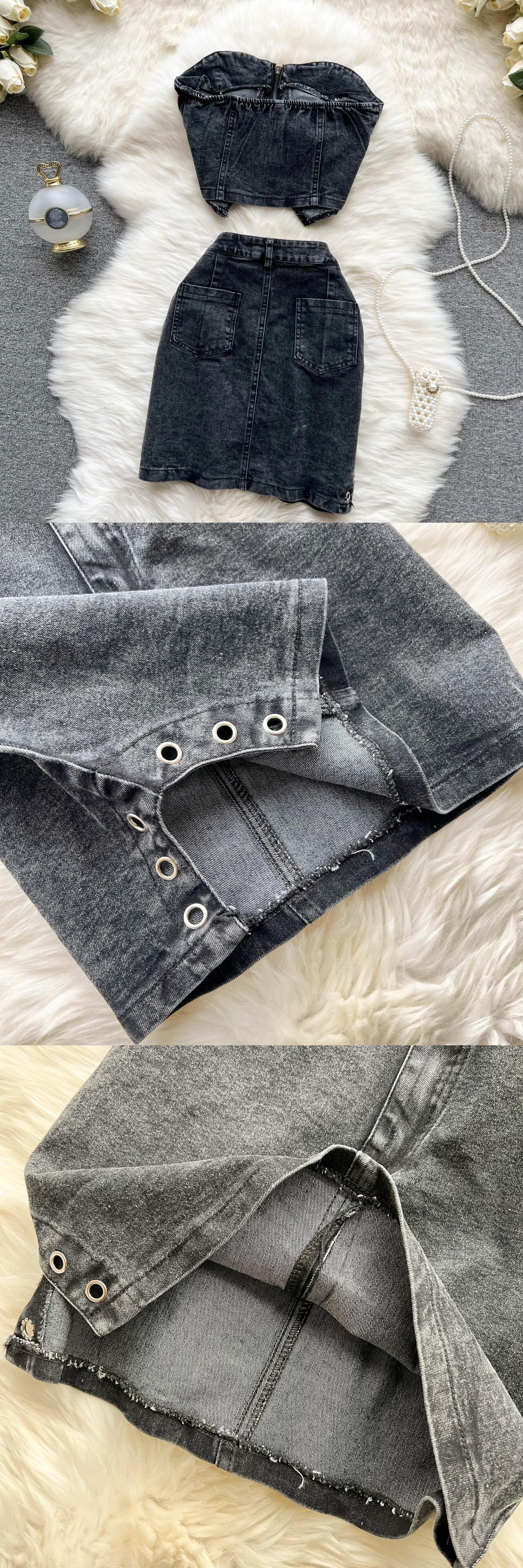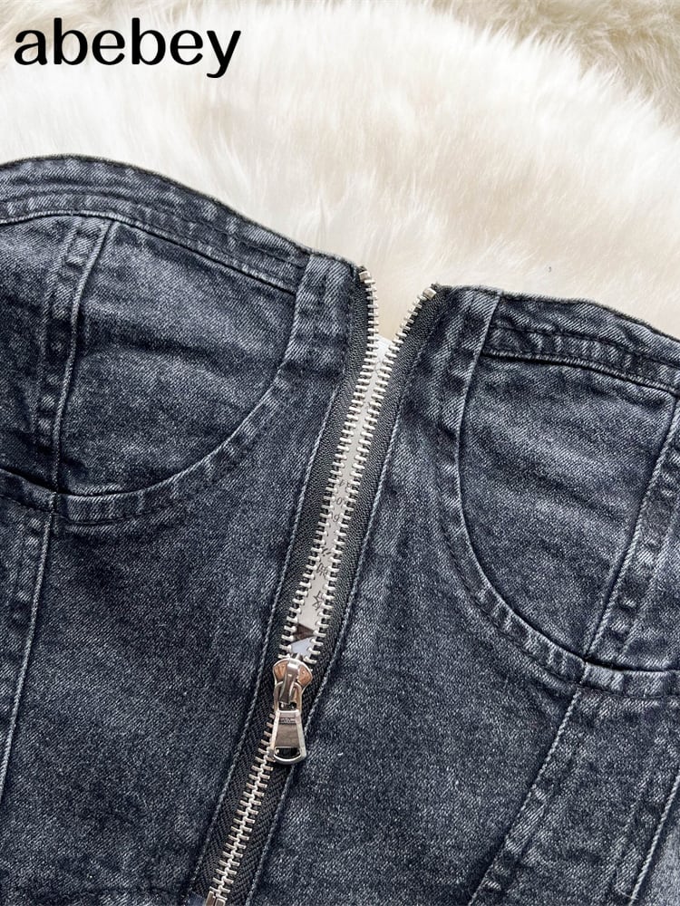 2022ジッパーマッチングセットストラップリーキャミストップとスカート女性セクシーなスタイルへそ露出ショートエンパイアデニムツーピースセット Abe40193261951