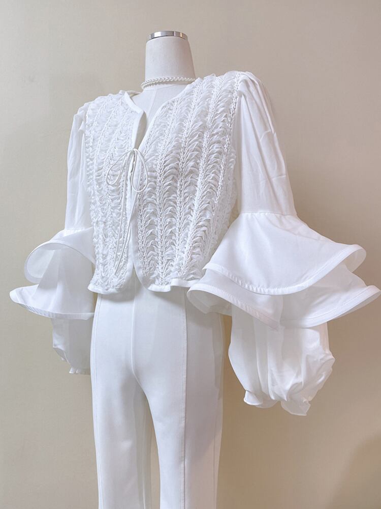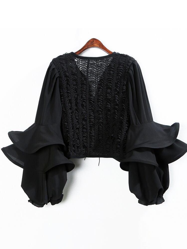 ブラックレースシャツレディースVネック長袖ソリッドフリルトリムベルトブラウス春スタイル2022 ロング スプリング 春物 ハーネス ソリッドカラー Abe14273341409