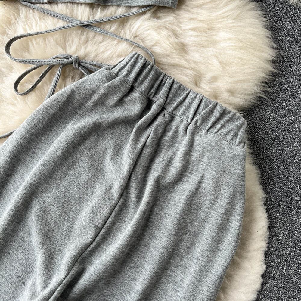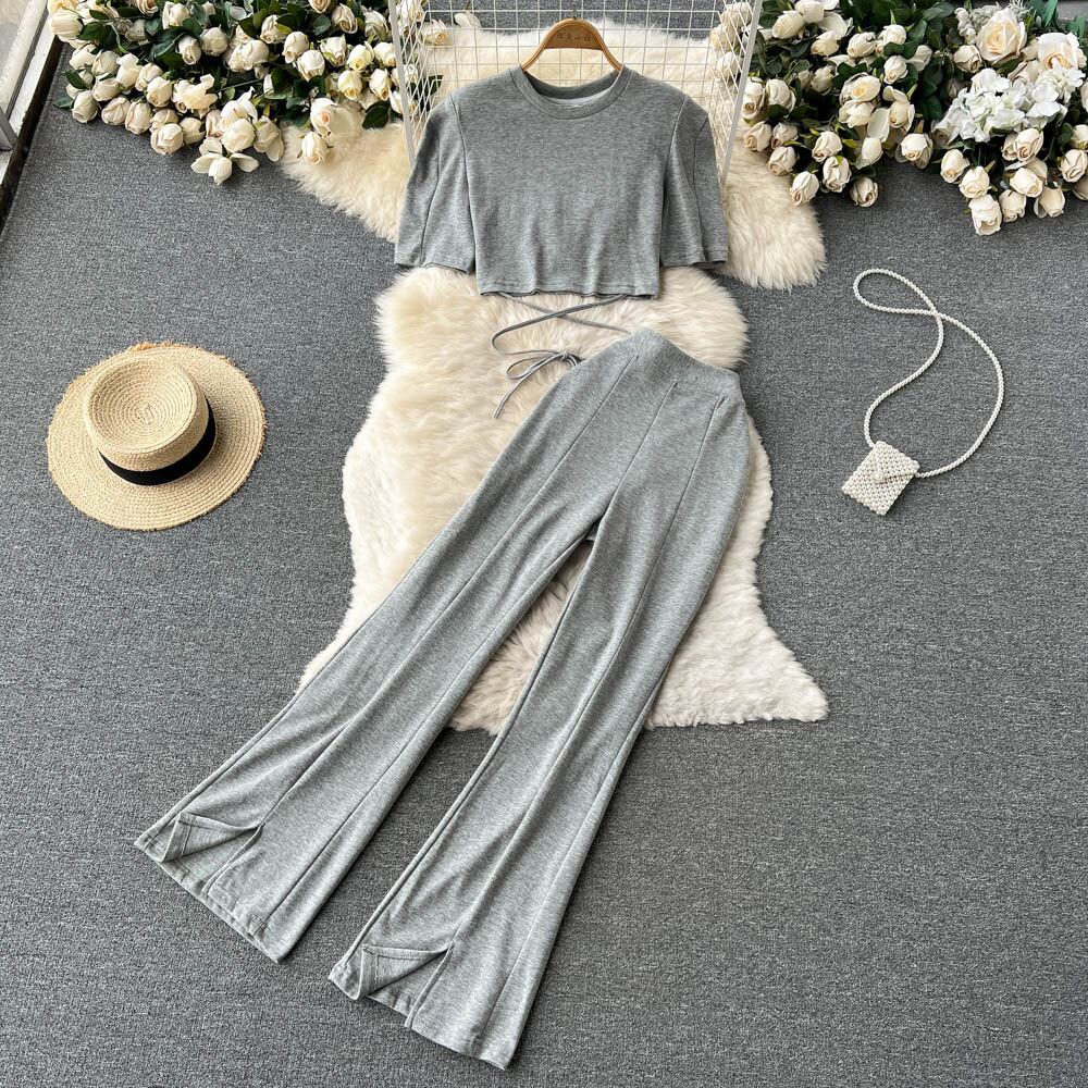 女性パンツセットボディコンスリムショートトップ+ワイドレッグロングパンツソリッドサマーツーピーススーツ 夏物 ワイドパンツ ソリッドカラー Abe31429706333