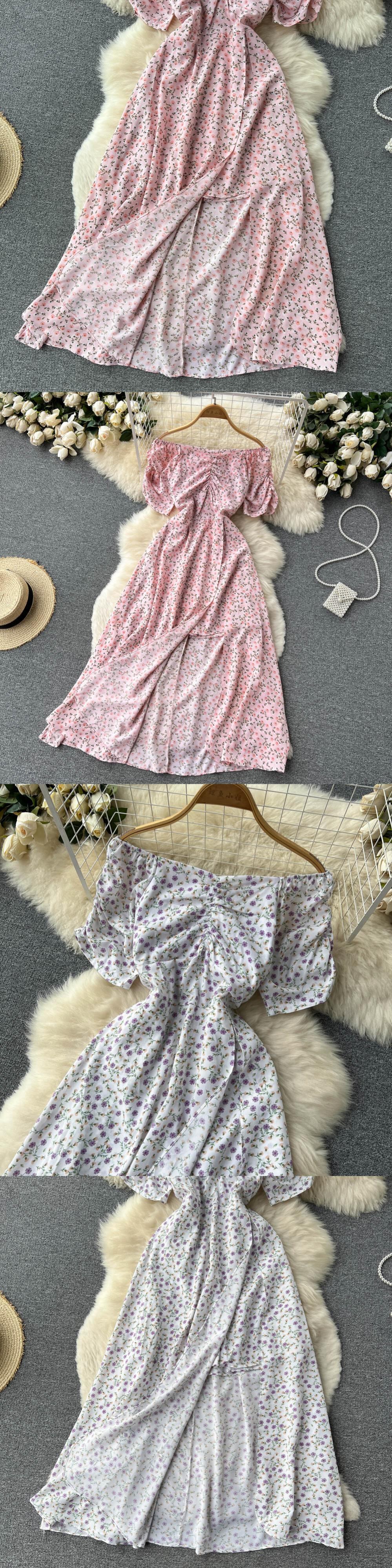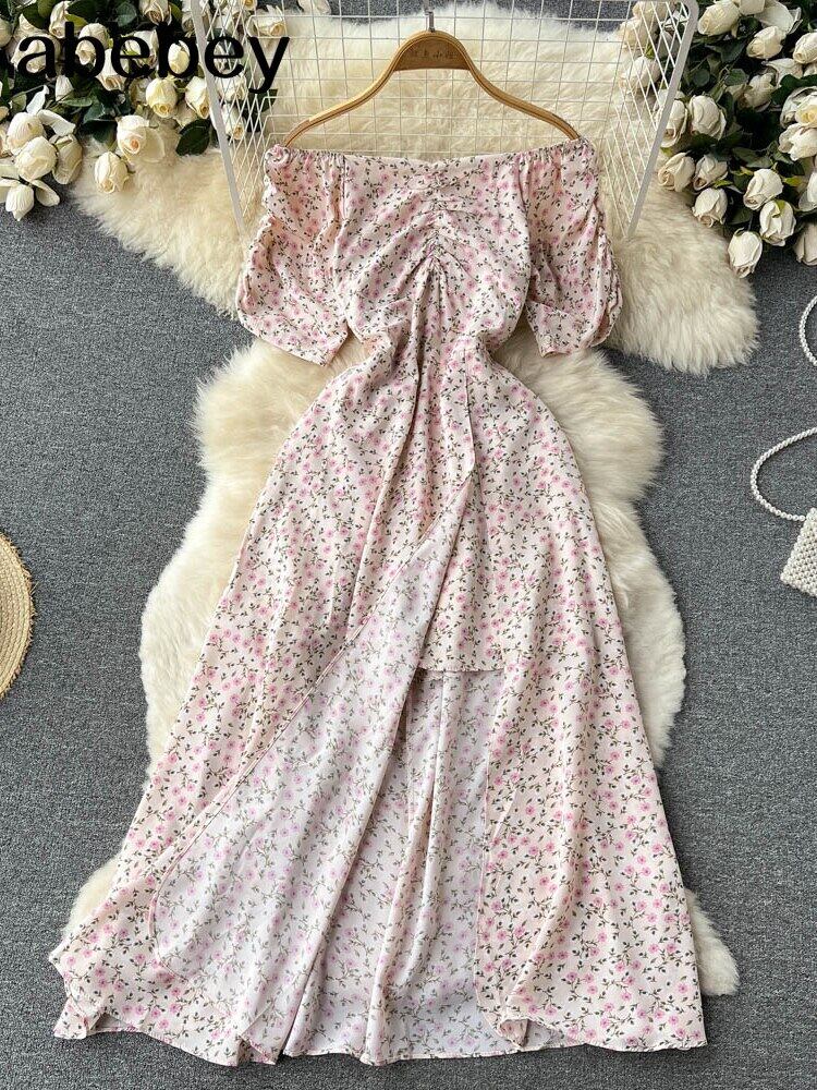 2022年女性フローラルラップドレスオフショルダータイアップフロントフリルミディドレスサマーオフィスレディスラッシュネックプリントラインドレス 夏物 花柄 Aライン 会社 学校 通勤や通学にも Abe5832549464
