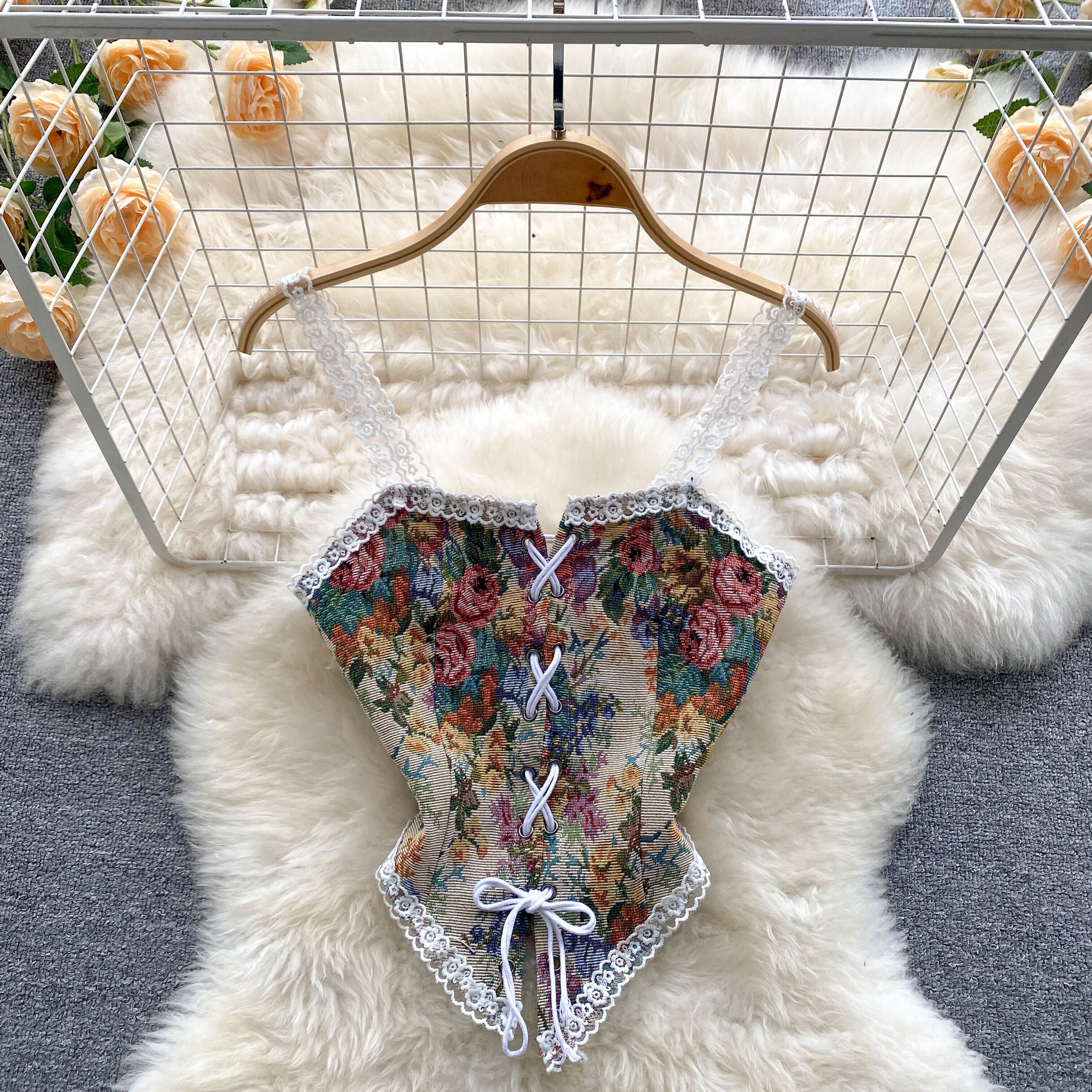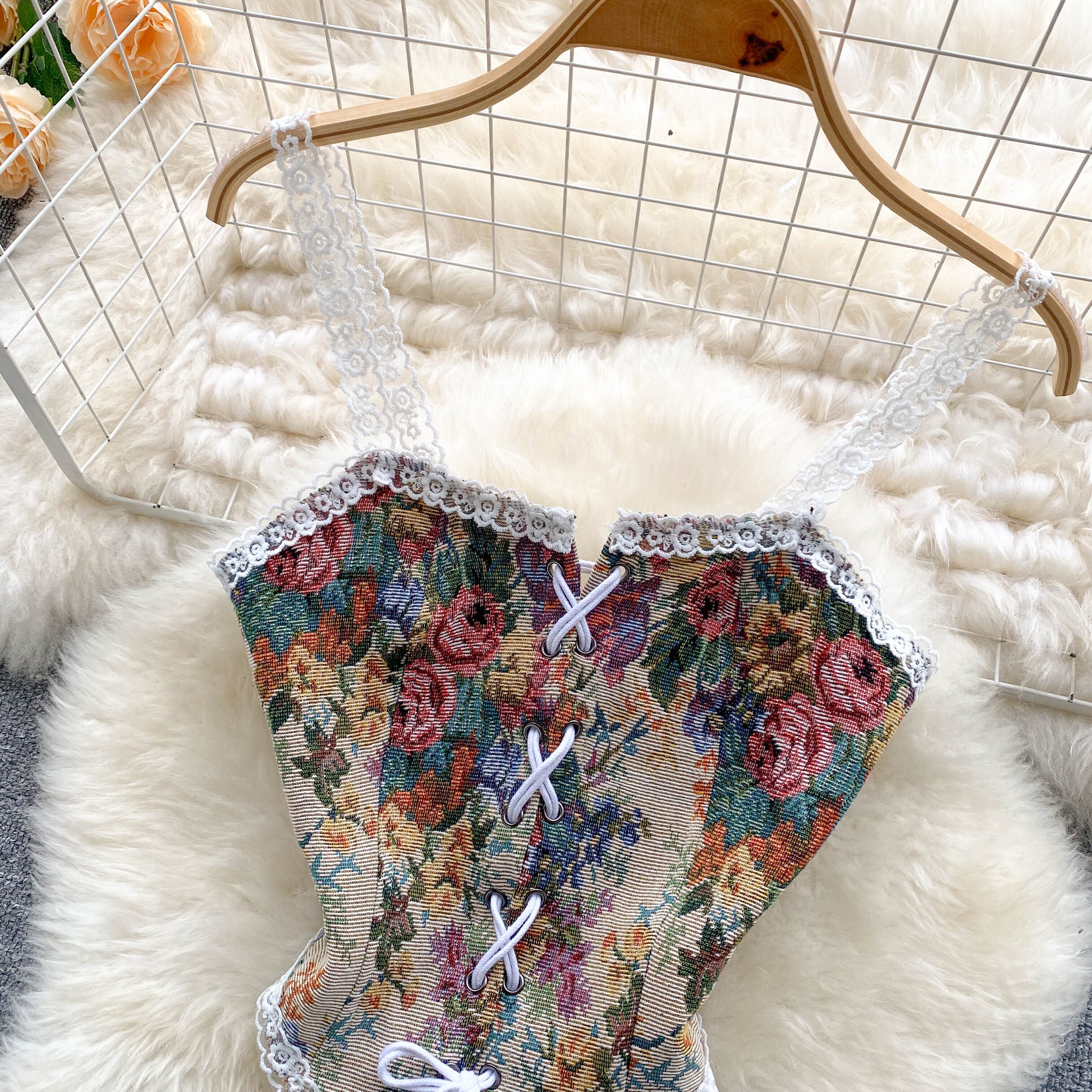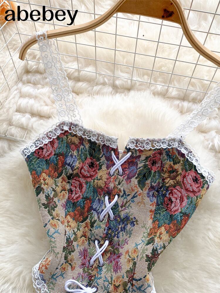 2022スタイルヴィンテージプリントホルタートップシックコルセットクロップトップ女性用包帯フローラルプリントノースリーブパーティークラブベスト 花柄 ビンテージ Abe28169365564