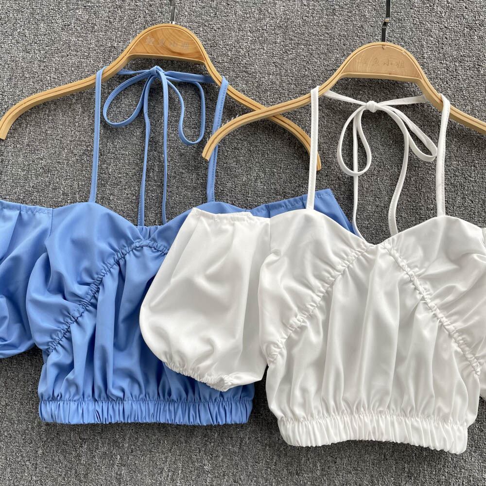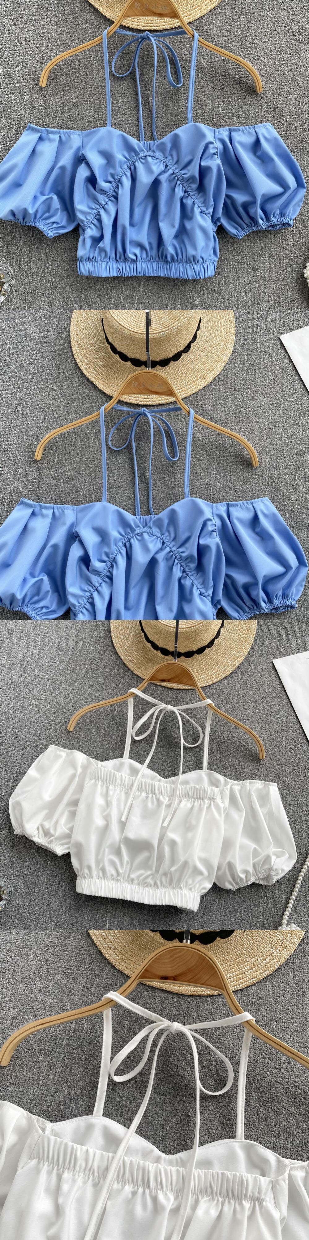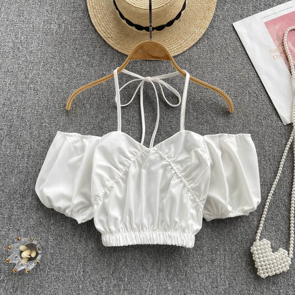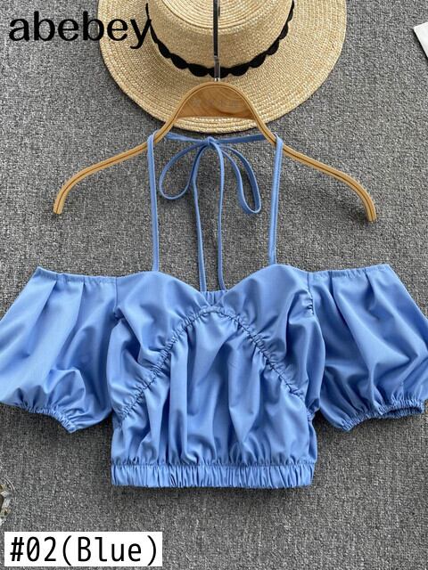 キャンディーカラーオフショルダークロップトップス女性2022年夏プリントランタンスリーブシャツレディセクシースラッシュネックビーチブラウス サマー 夏物 Abe88732518742