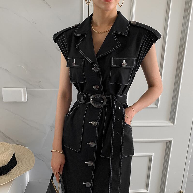 ノッチカラードレス女性サマーサファリスタイルシングルブレストベルトスリムウエストポケットドレスストリートウェア 夏物 ハーネス Rhc50415216947