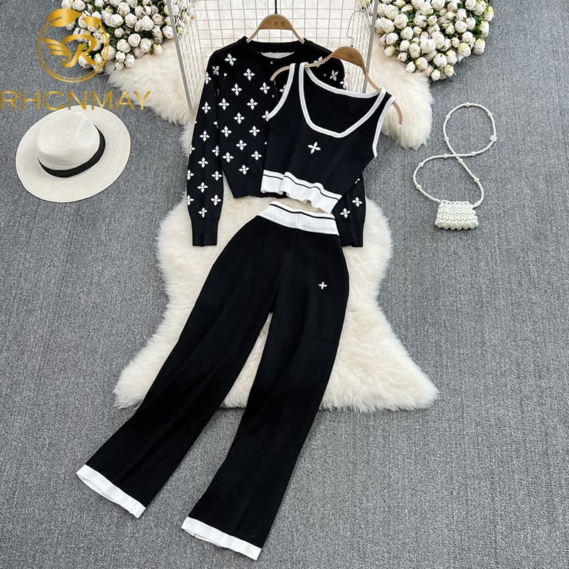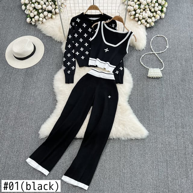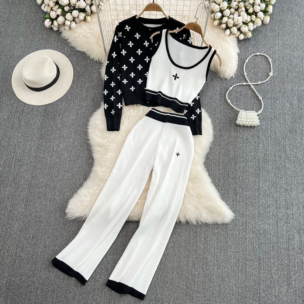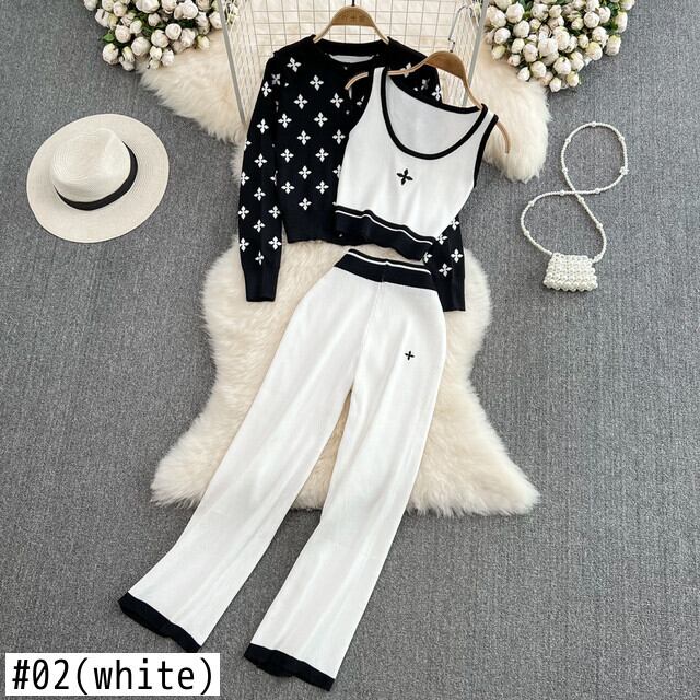 ニットトラックスーツレディース春秋3点セット長袖カーディガン+セクシーベスト+ワイドレッグパンツスーツ ロング スプリング 春物 オータム 秋物 ワイドパンツ Rhc83642203036