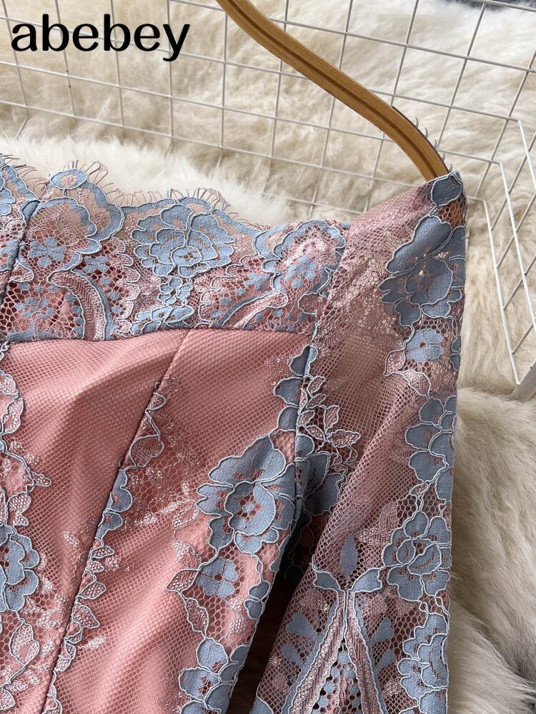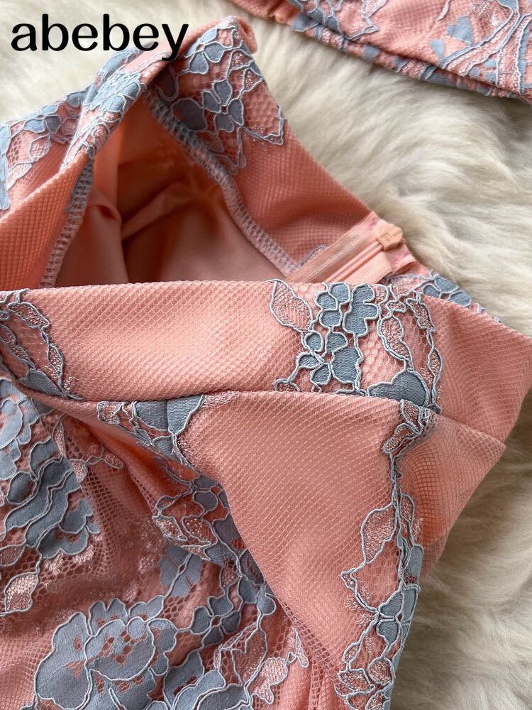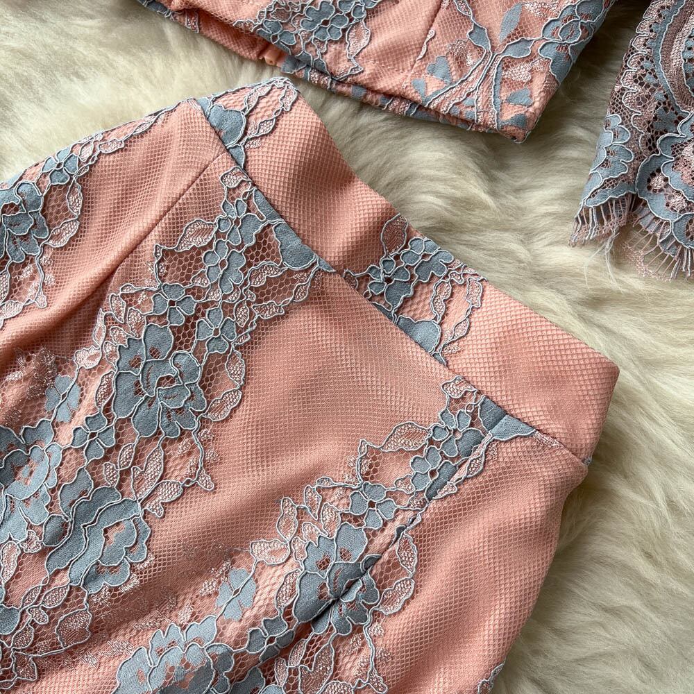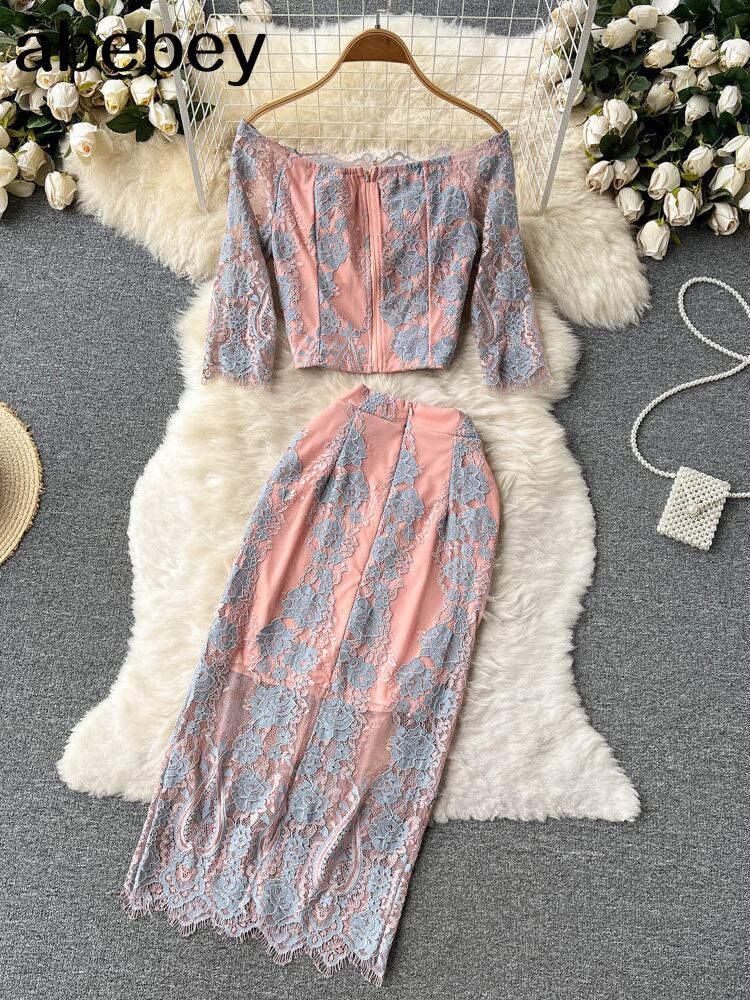 レースニットスリムビーチレディースセット2022年夏スラッシュネックショートトップスパーティーセクシーボディミドル丈スカートツーピースセット サマー 夏物 Abe4026091819
