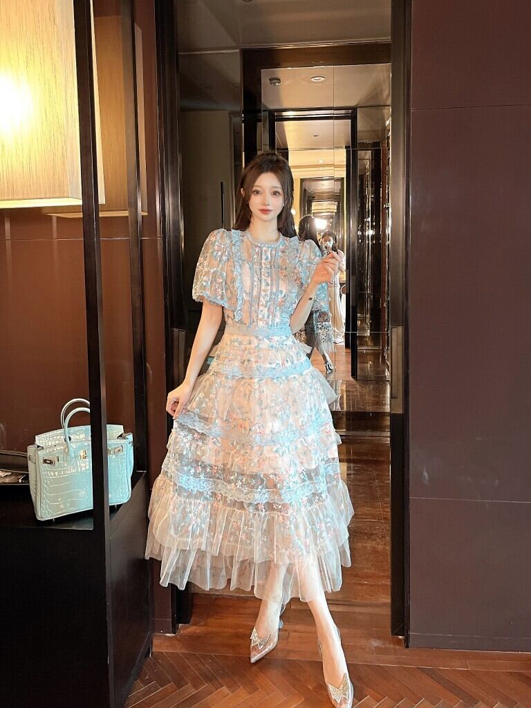女性ウエディングドレスサマー半袖フローラルプリントメッシュフリルカスケードロングマキシウェディングイブニングパーティードレス ショート ハーフスリーブ ラッフル 夏物 花柄 Rhc2761645132