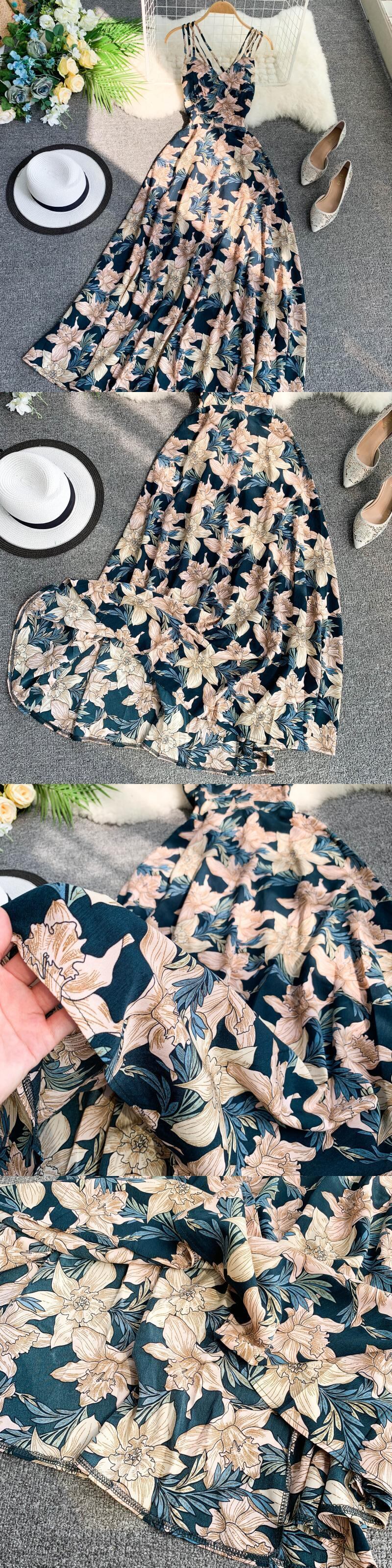 2022ヴィンテージVネックサマーフローラルプリントミディロングドレスバックレススパゲッティストラップレディースビーチホリデーVestidosサンドレス 夏物 花柄 ビンテージ Abe92979565503