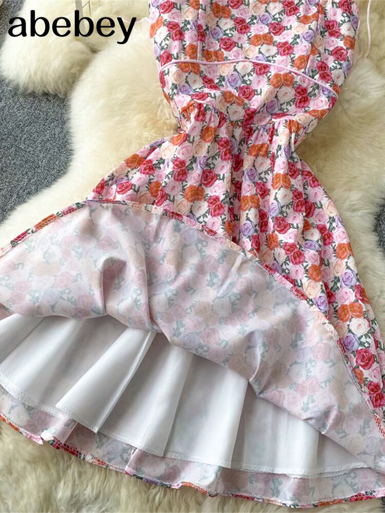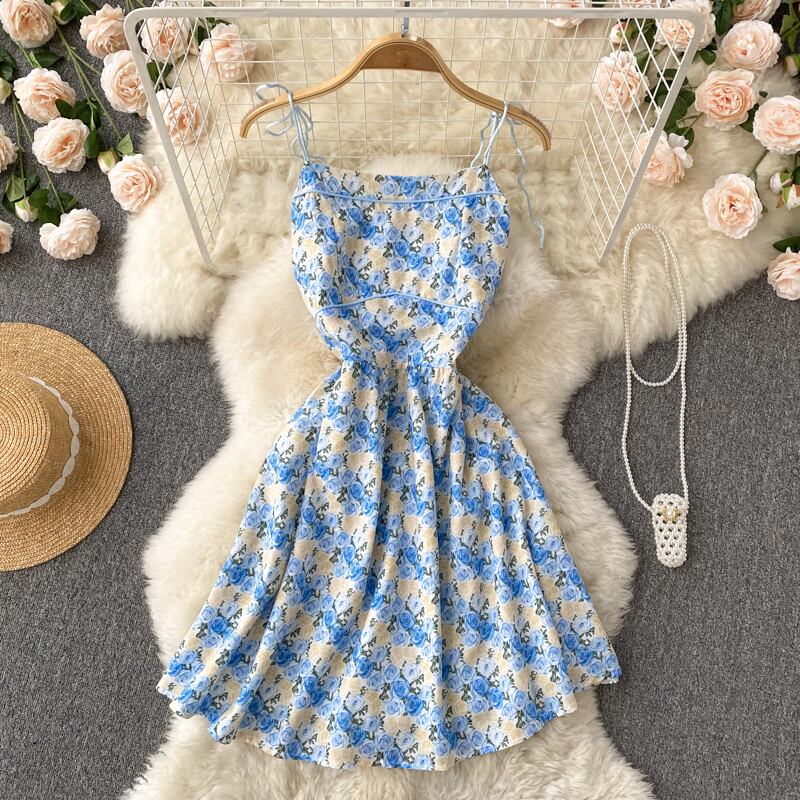 ドレス女性スウィートガールズレトロフローラルベーシックサンドレスサマースパゲッティストラップミッドカーフ伸縮性Aラインカジュアルホリデーヴェスティドス 大人ガーリー キュート 夏物 花柄 Abe47301478855