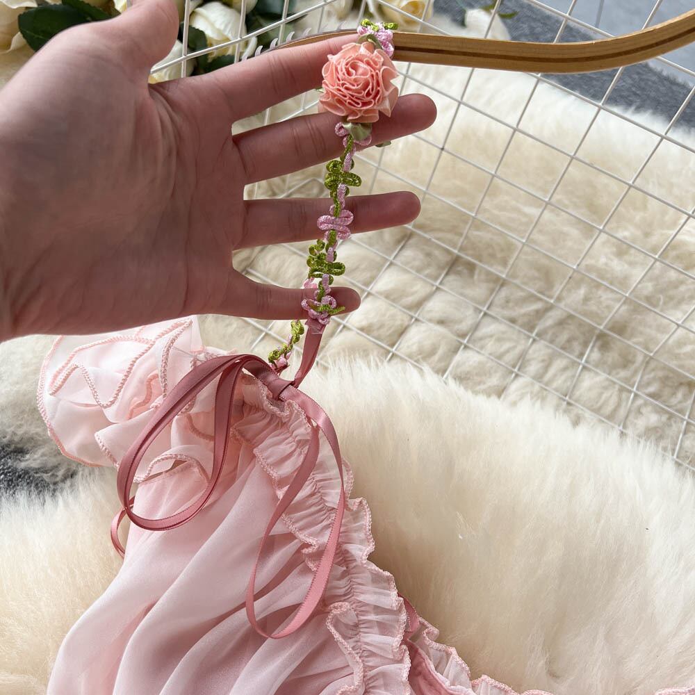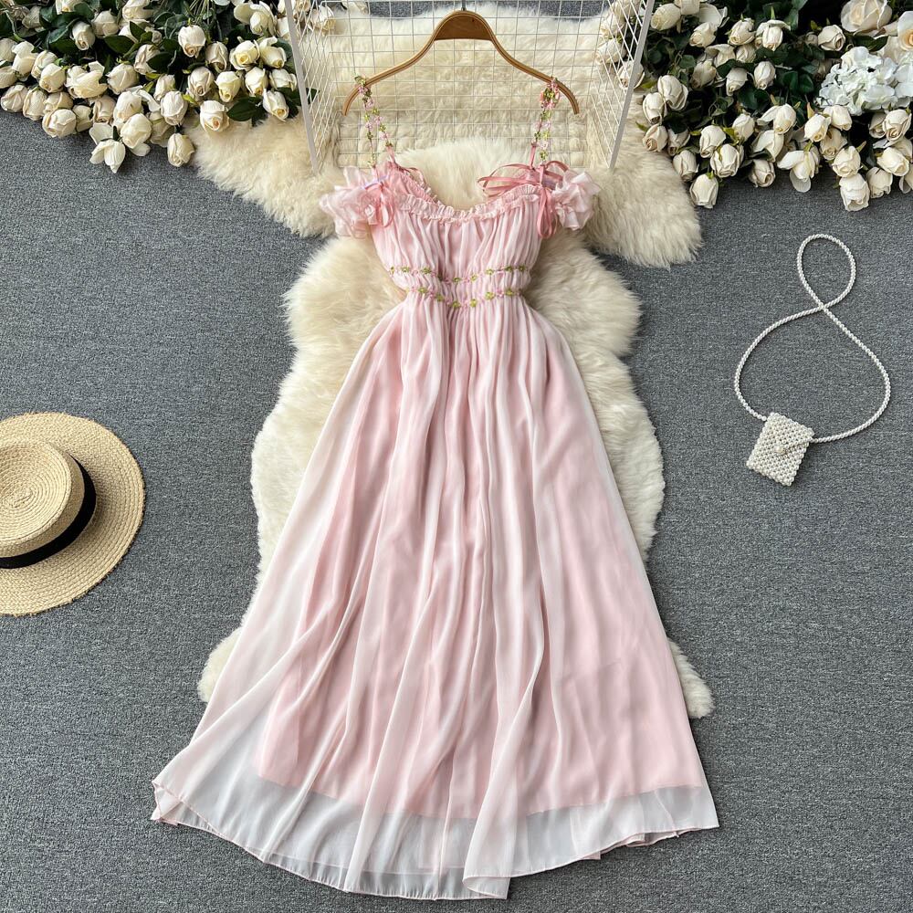 ピンクフローラルプリントスリングレディースドレスサマーレジャーホリデースタイルハイウエストミディドレスフリル女性ドレス ハイウェスト 夏物 花柄 Abe7609395340