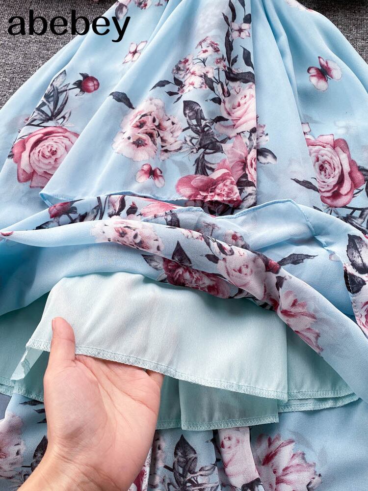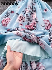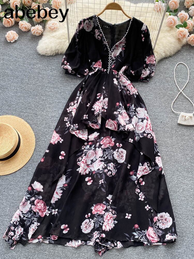 ヴィンテージサマーイレギュラーAラインVネックオフィスレディフローラルシフォンマキシロングドレスレトロローブ 夏物 花柄 ビンテージ 会社 学校 通勤や通学にも Abe37372919495