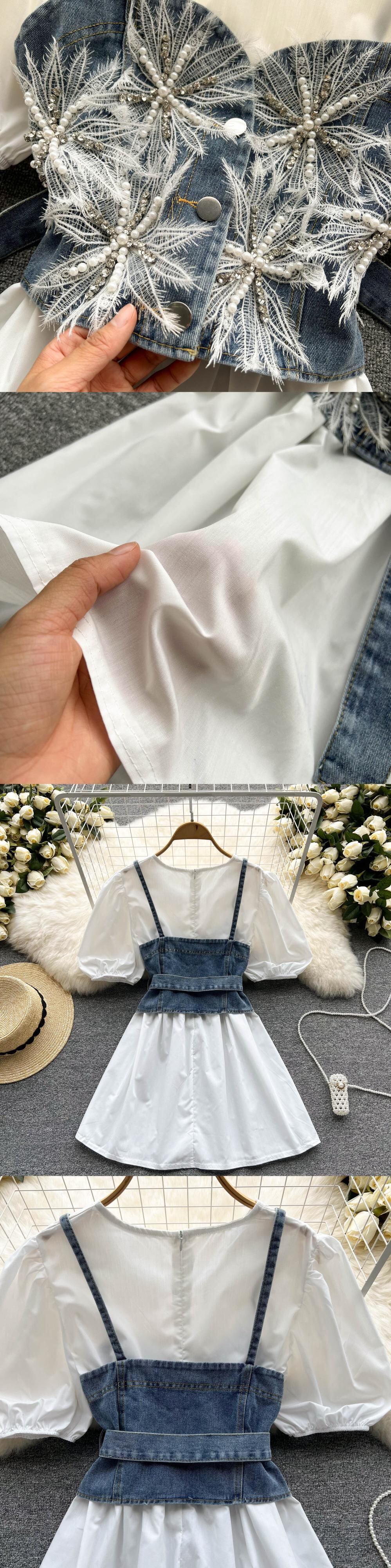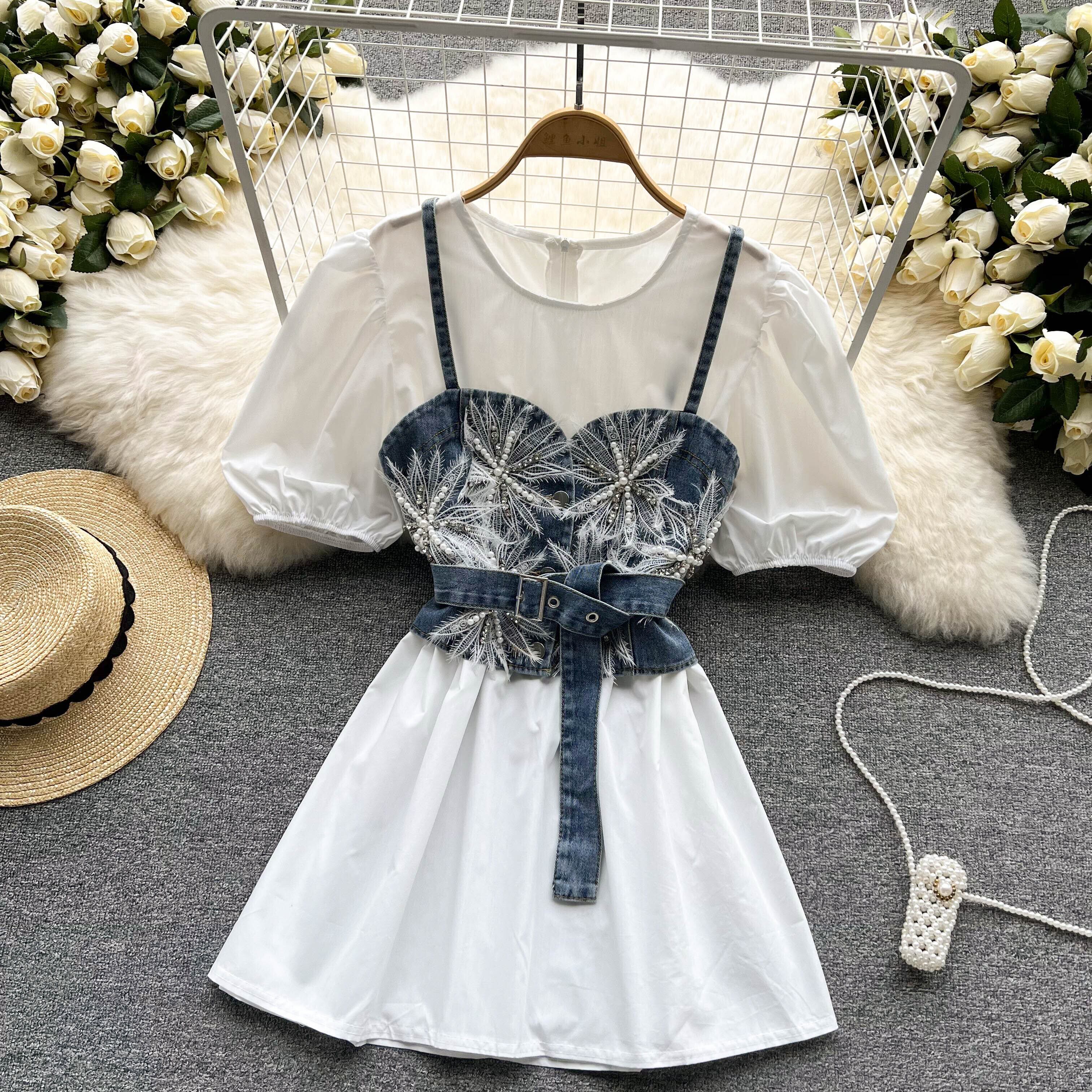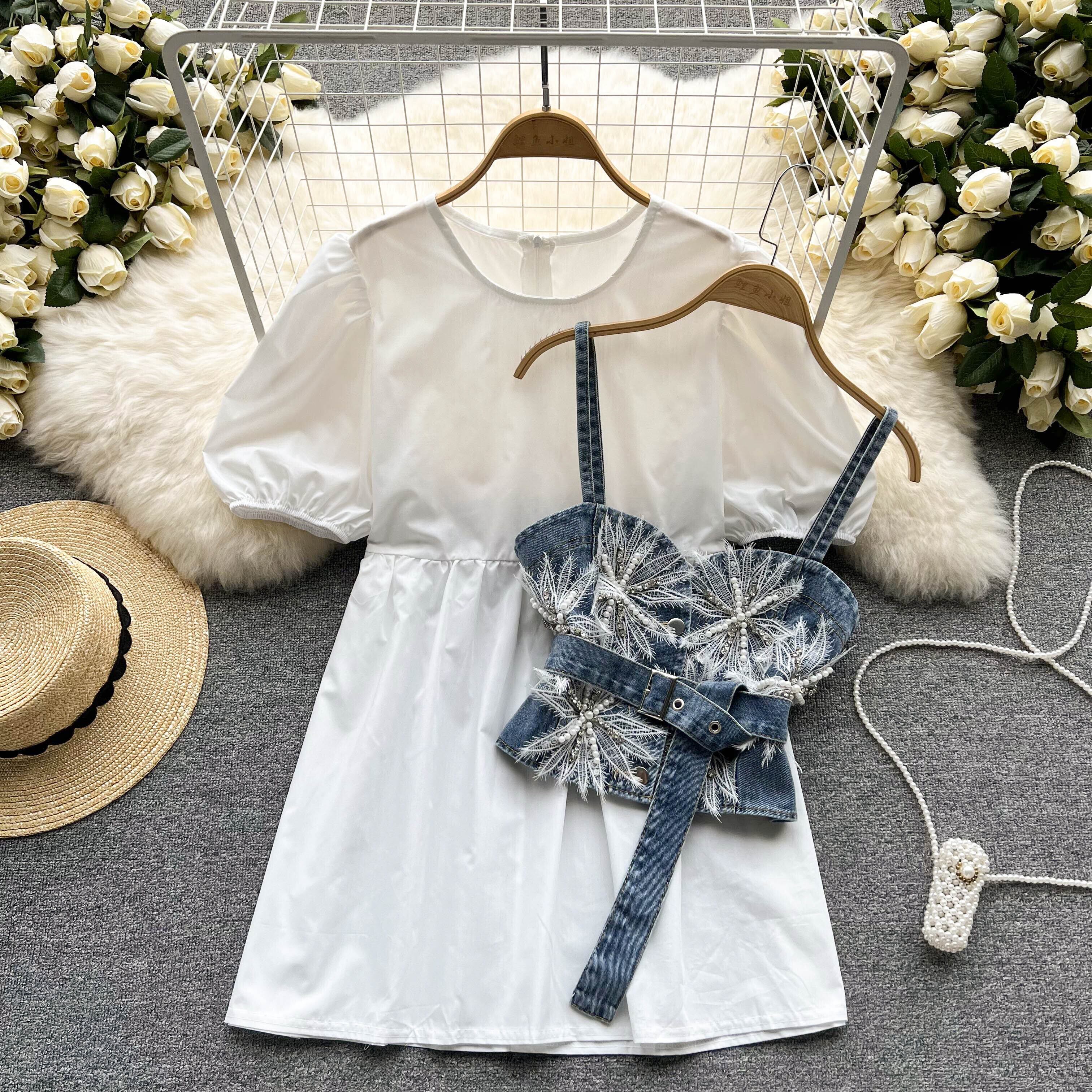 ドレススーツレディース2022夏レトロ半袖プリントドレスデニムカミスツーピースセット ショート ハーフスリーブ サマー 夏物 Abe1575586162