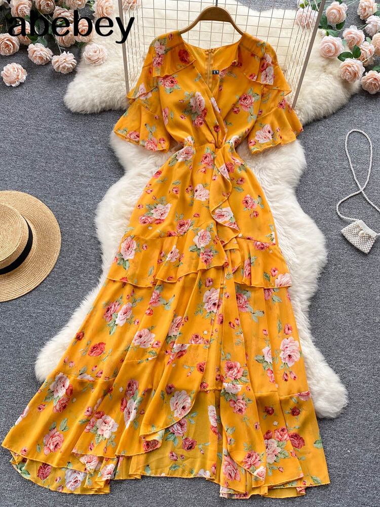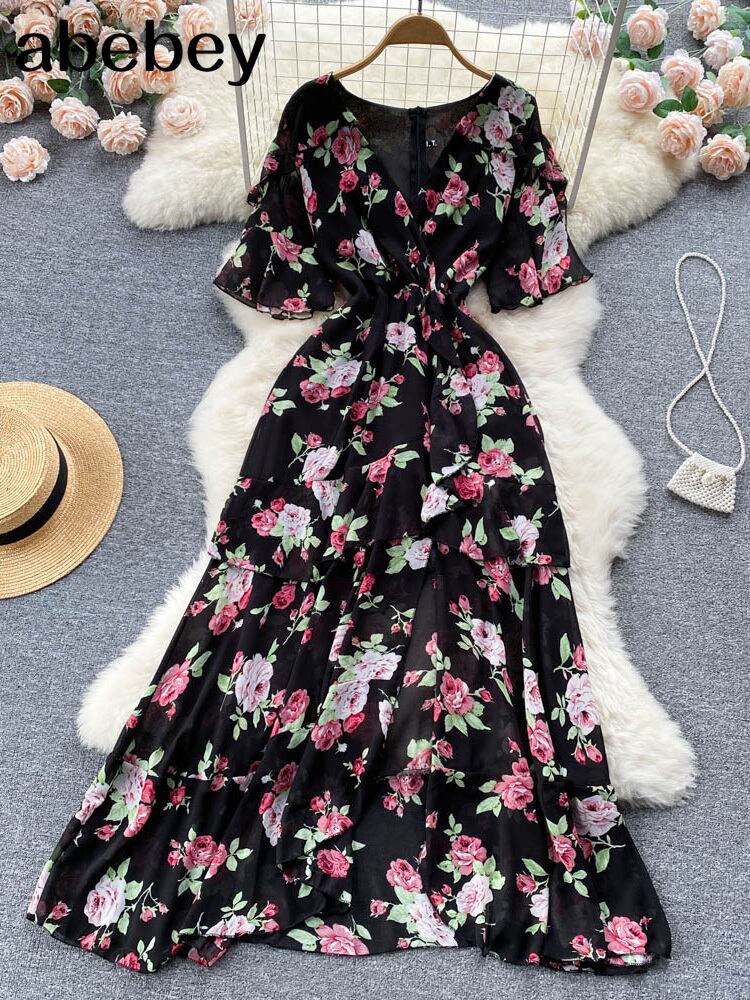 2022年女性フローラルプリント半袖Vestidosヴィンテージケーキマキシドレスサマーカスケードフリルパーティードレス ショート ハーフスリーブ ラッフル 夏物 花柄 ビンテージ Abe23826478701