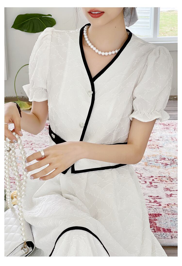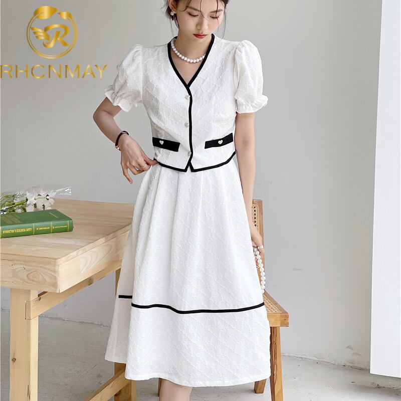 フランスの気質シャツ女性ヒットカラーパフ半袖ジャケットトップ+セクシーなミッドストライプスカートスーツツーピースセット ショート ハーフスリーブ Rhc89405071614