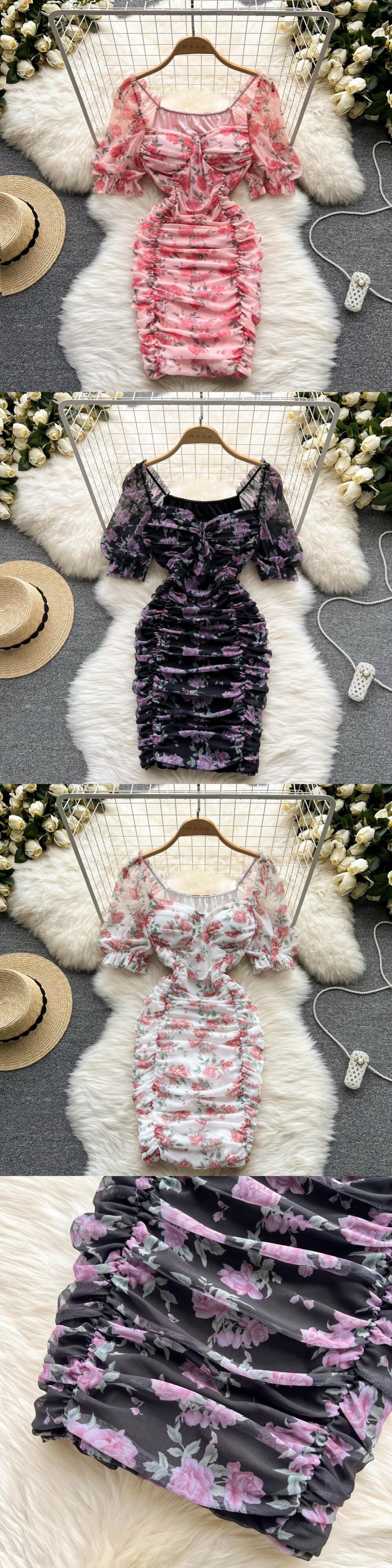 ジェントルローズプリントローブ半袖スリムウエストスプリットドレスレディーススクエアカラーメッシュプリーツVestidos ショート ハーフスリーブ スクウェア Abe16064748197