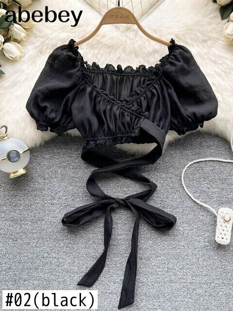 レディースオフショルダートップ半袖フリルヴィンテージブラウスパフスリーブレースアップトップスバンデージクロップトップスブラックホワイト ショート ハーフスリーブ ビンテージ Abe2165270639
