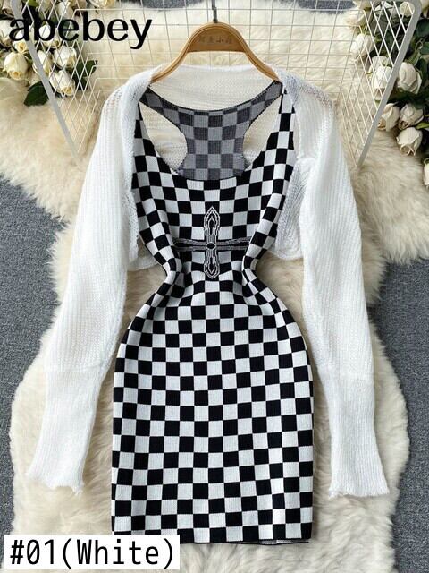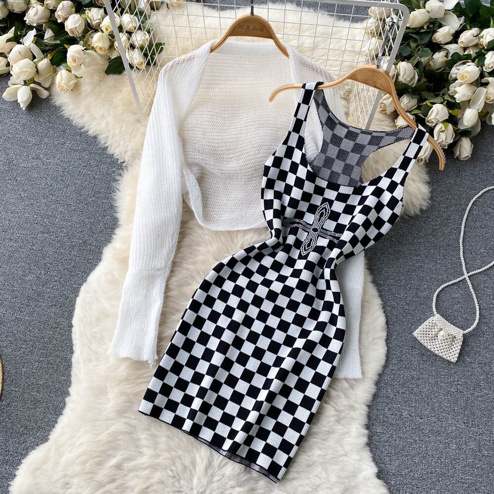 ドレススーツレディース2022サマーニットボディコンレトロノースリーブドレスニットカーディガンツーピースセット 夏物 Abe61798463236