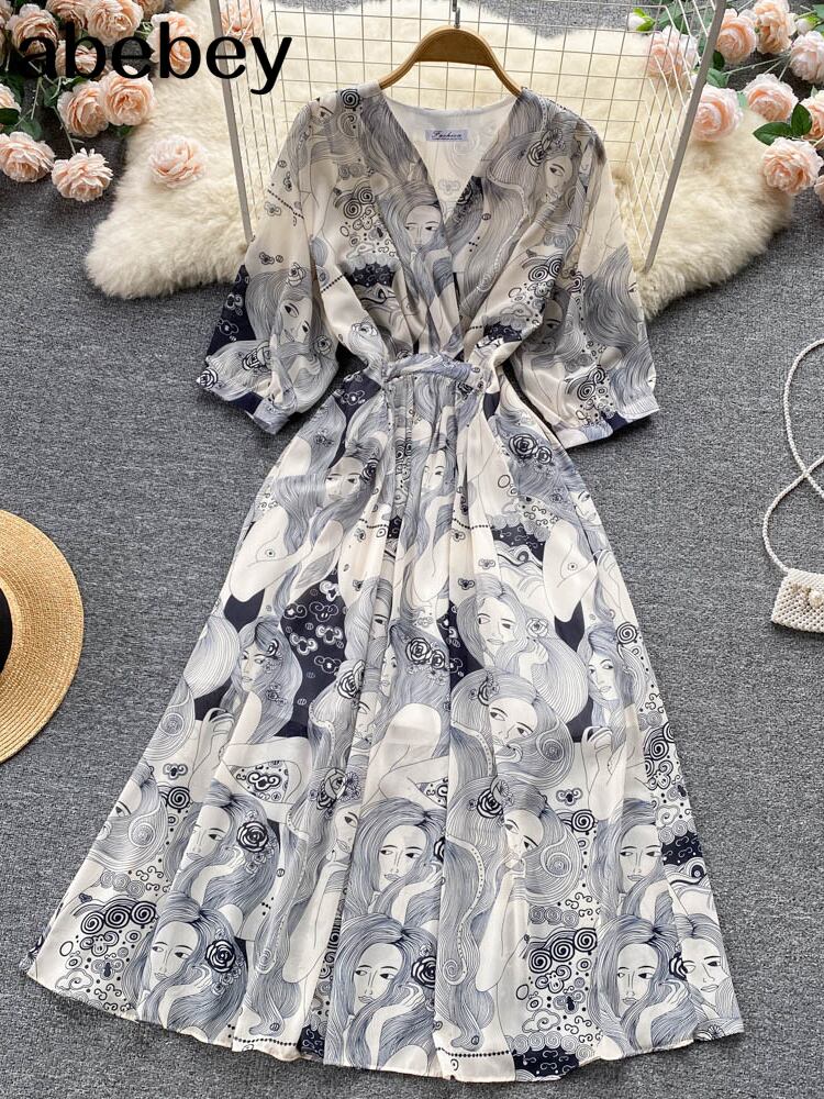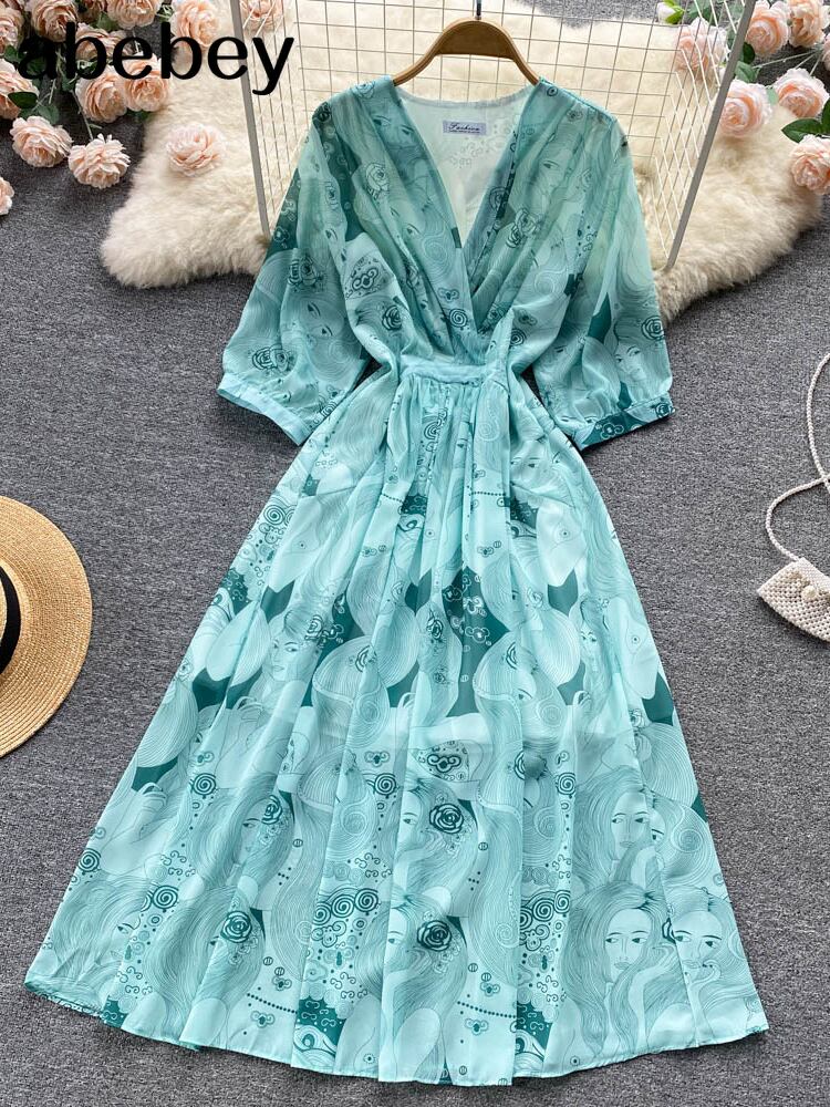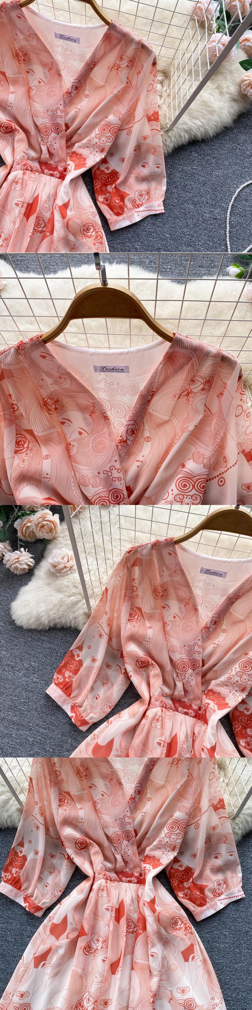 セクシーなVネックフローラルドレス2022半袖ウエストプリントドレス女性サマーシフォンドレス ショート ハーフスリーブ 夏物 花柄 Abe94422220994
