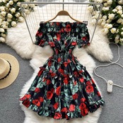 夏のプリントヴィンテージロングドレス女性セクシーなオフショルダーフリルパーティーミディドレス2022ビーチサンドレス サマー 夏物 ビンテージ Abe65681459002