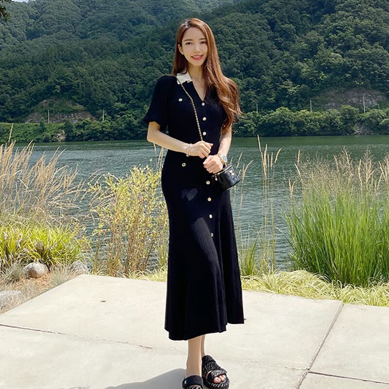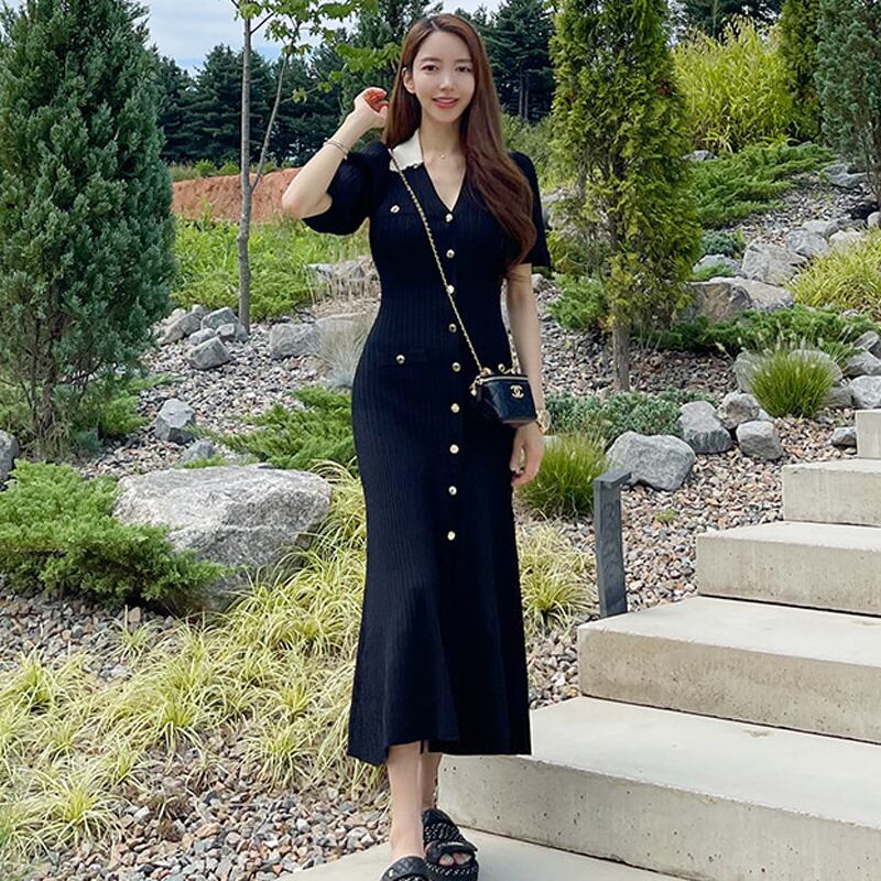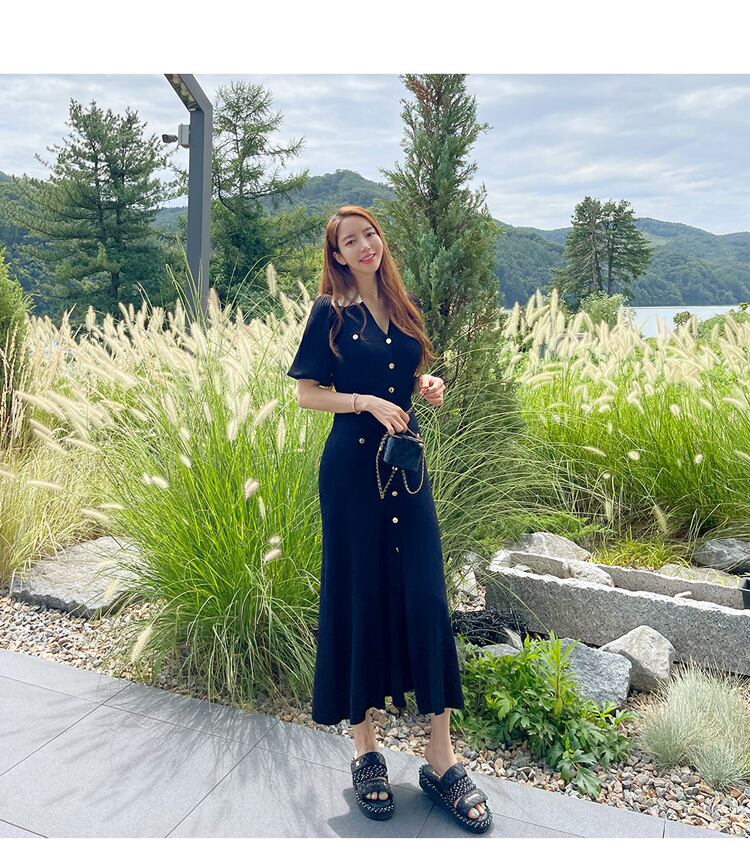 黒のシングルブレストロングドレス女性半袖Vネックマーメイドドレス ショート ブラック ハーフスリーブ Rhc69158028916