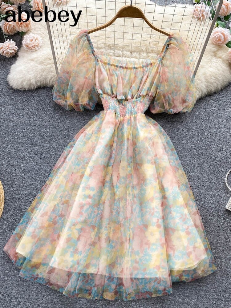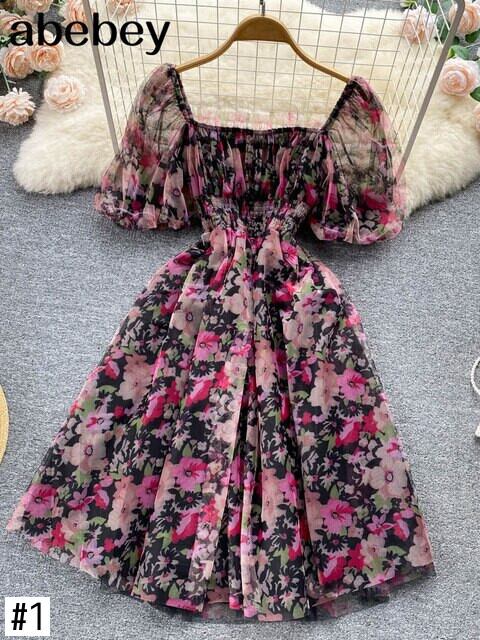 フラワープリントセクシードレス女性スプリットオフショルダーミディロングドレスバックレスAラインサマードレスVestidos 夏物 フラワーデザイン Abe46201127004