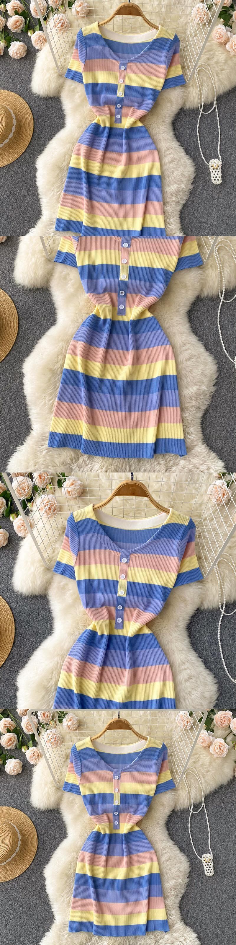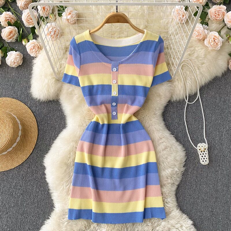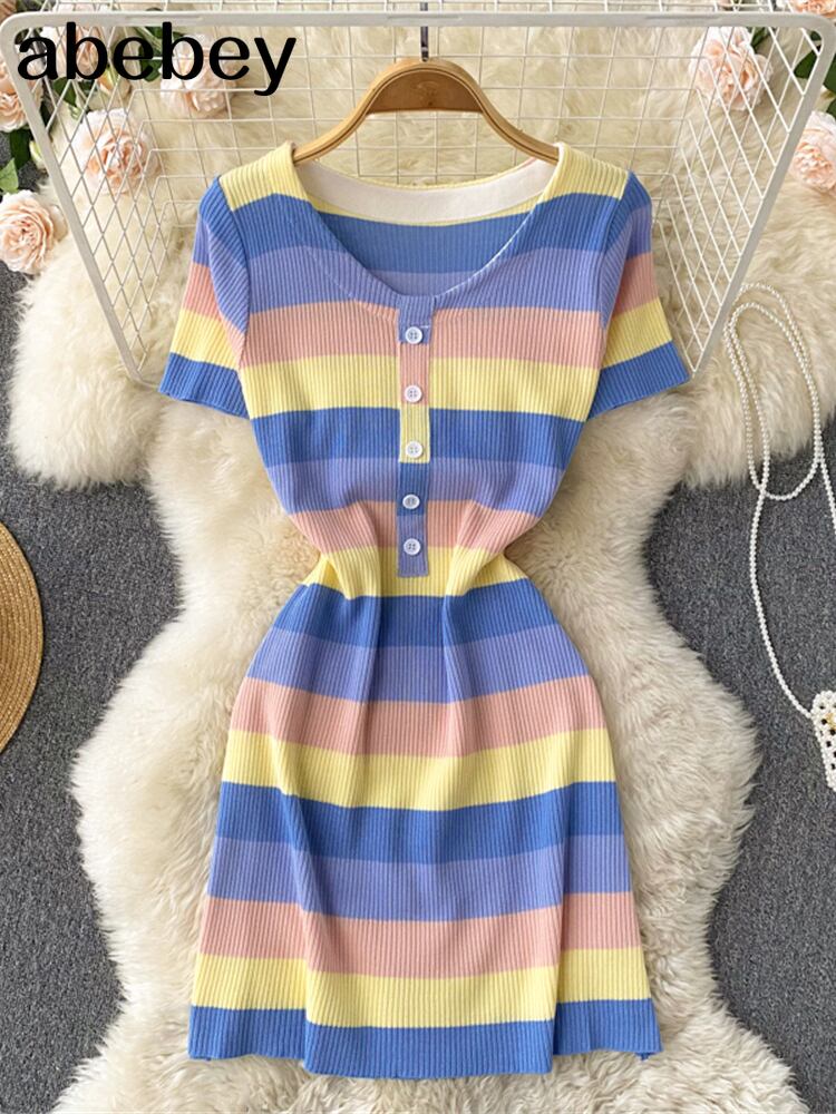 2022年夏夏ニットレインボーストライプVネックワンピース女性膝丈ストレートワンピースボディコン サマー 夏物 ドレス Abe80114981693
