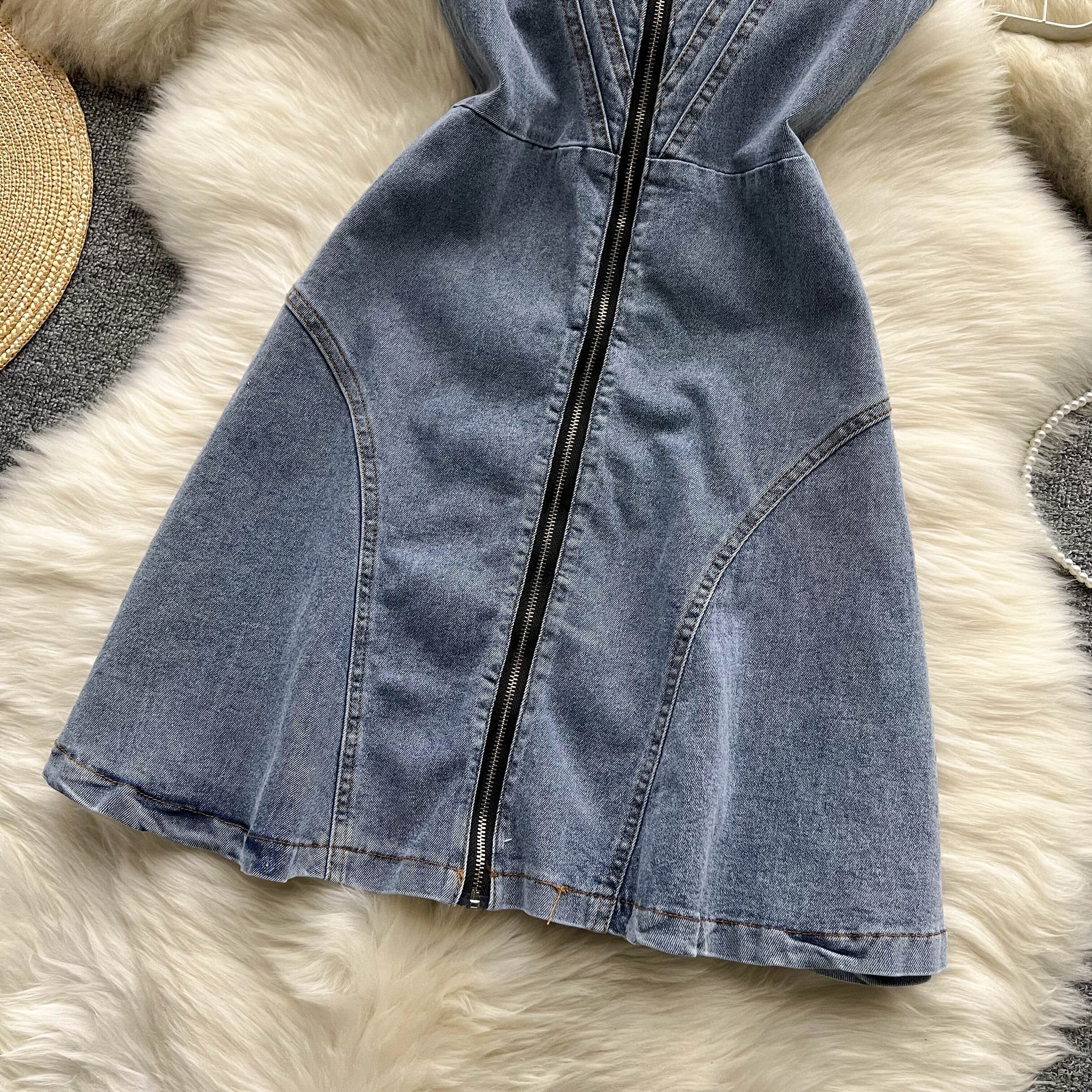 女性ストリートウェアストラップミニドレス2022年夏ソリッドデニムAラインオフィスレディドレスサンドレスローブ サマー 夏物 ソリッドカラー 会社 学校 通勤や通学にも Abe80453101923