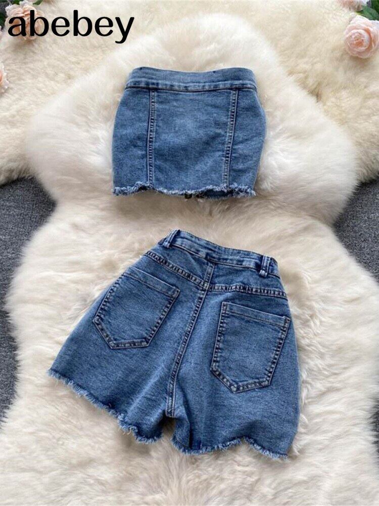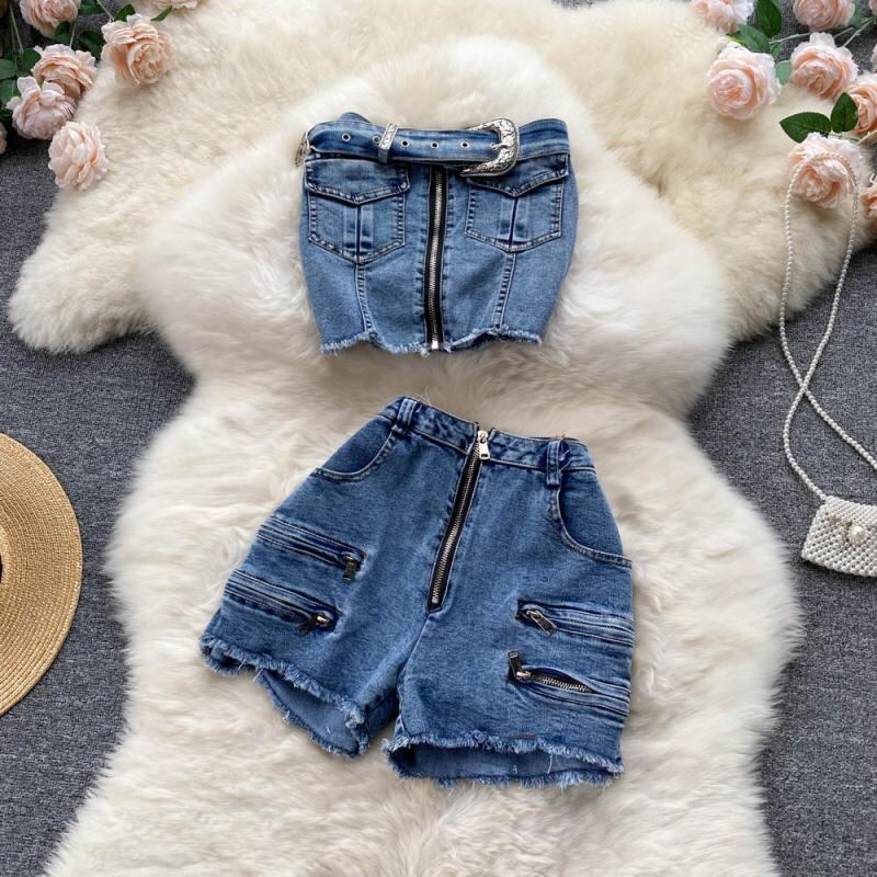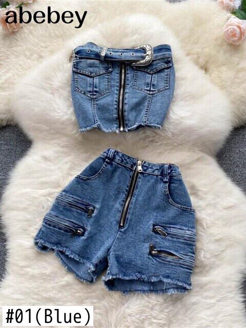 2022年ランウェイサマーパンツスーツレディースデニムセクシーストラップレスクロップトップとショーツ22ピースセット衣装 夏物 ブルマー Abe71247439446