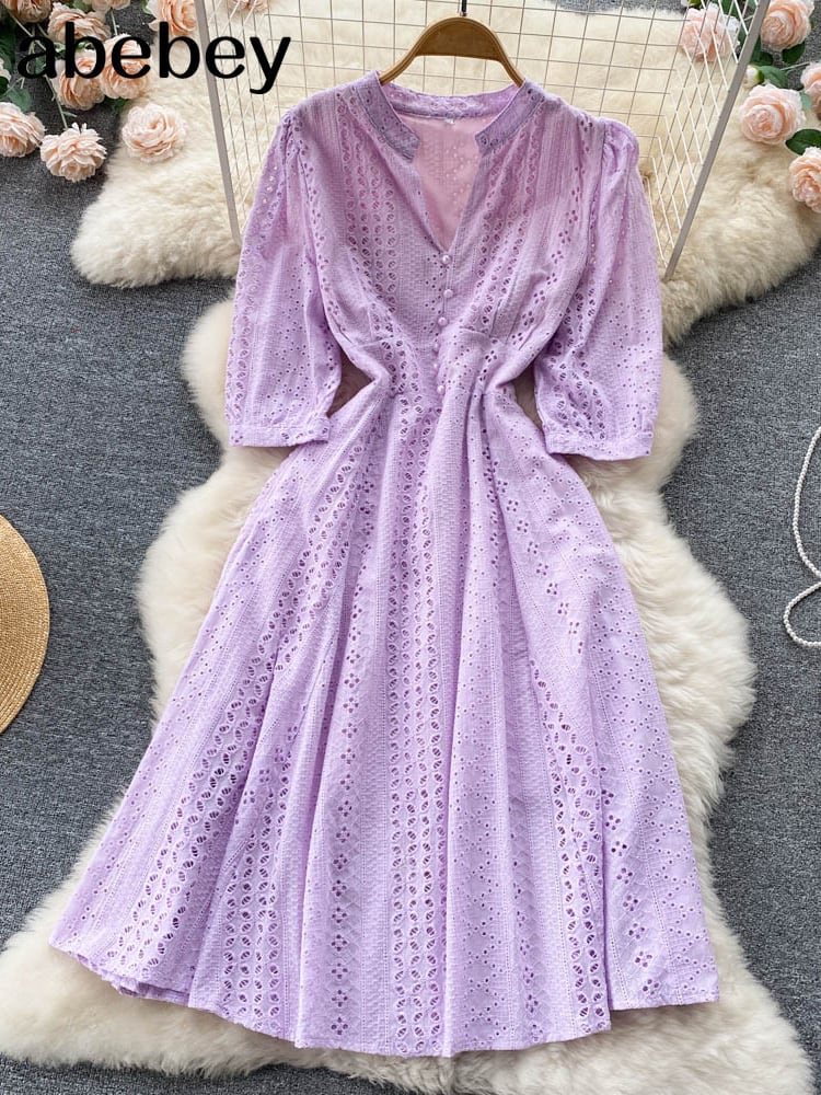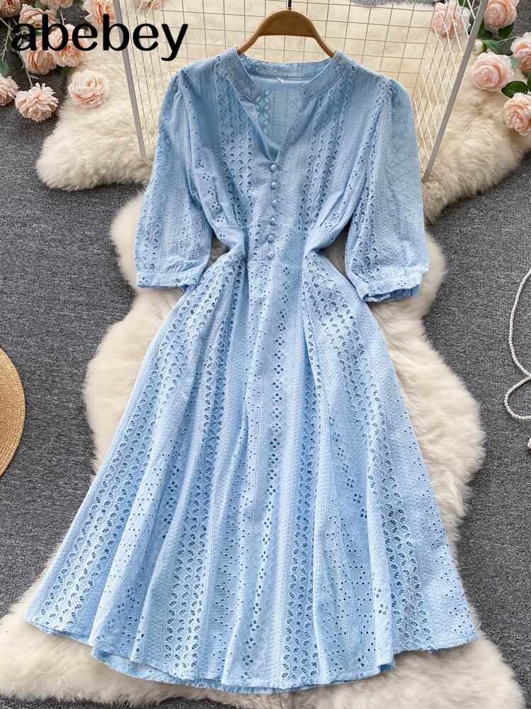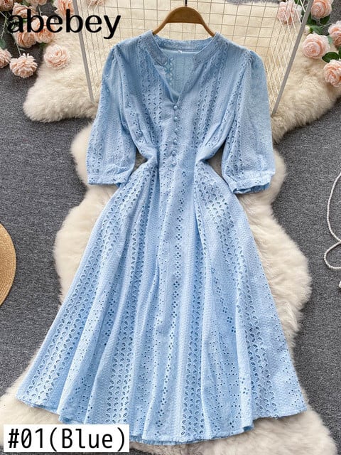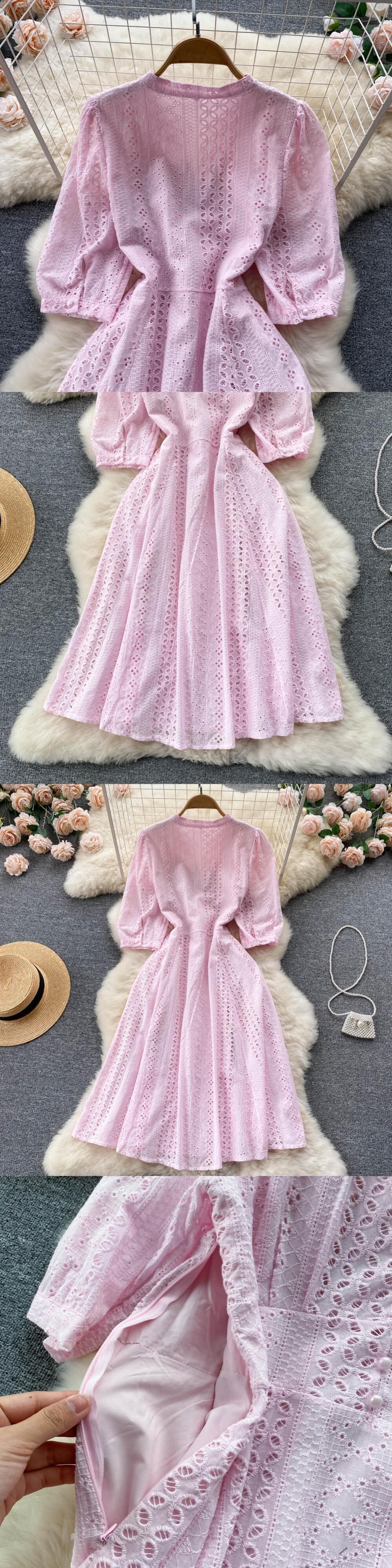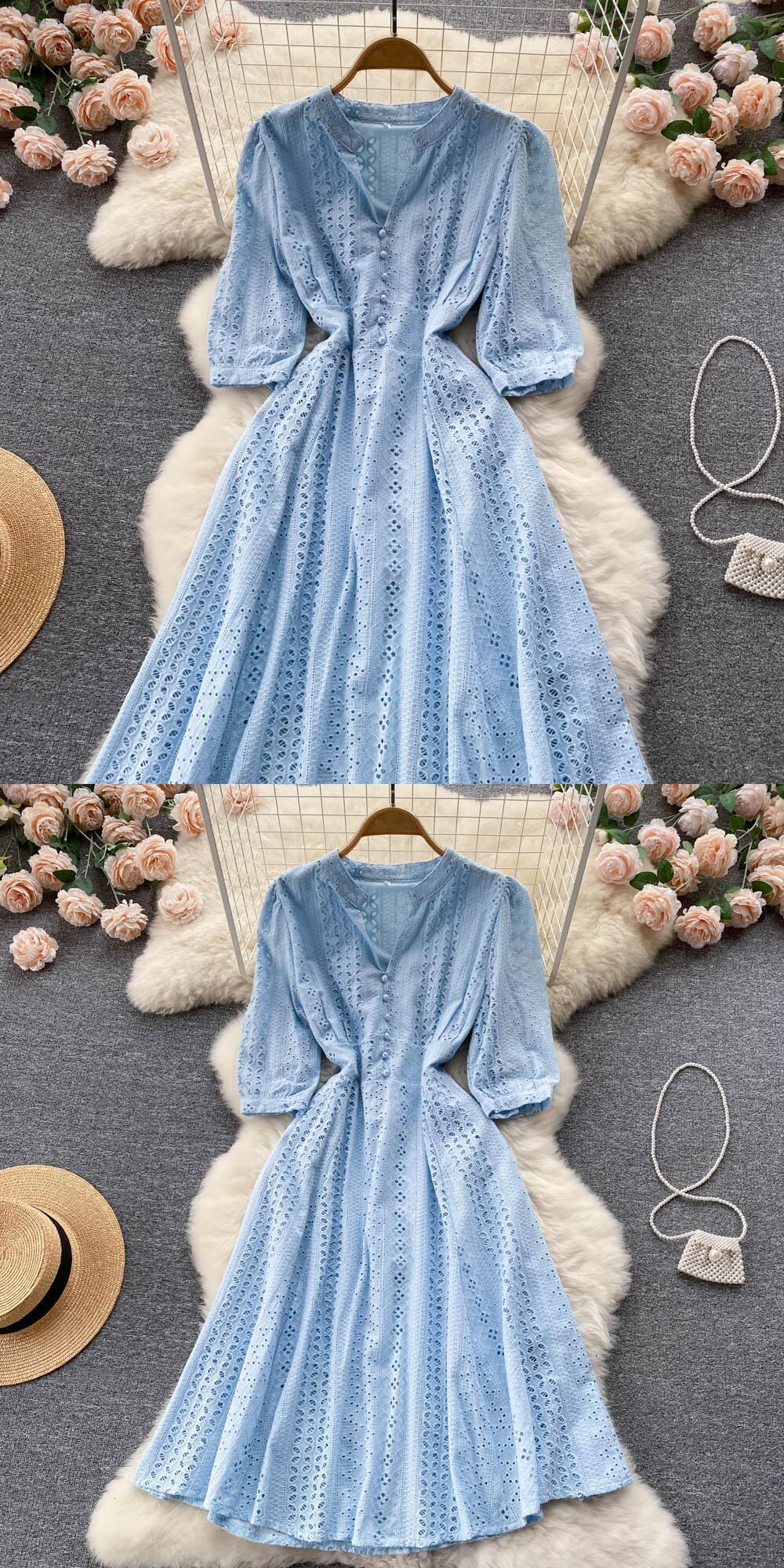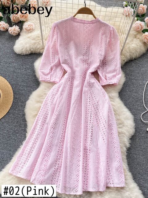 女性中空アウトレースドレスオフィスレディサマーソリッドVネックボタンアップ2022ミディドレスシックな半袖ドレス ショート ハーフスリーブ 夏物 ソリッドカラー 会社 学校 通勤や通学にも Abe32016818274