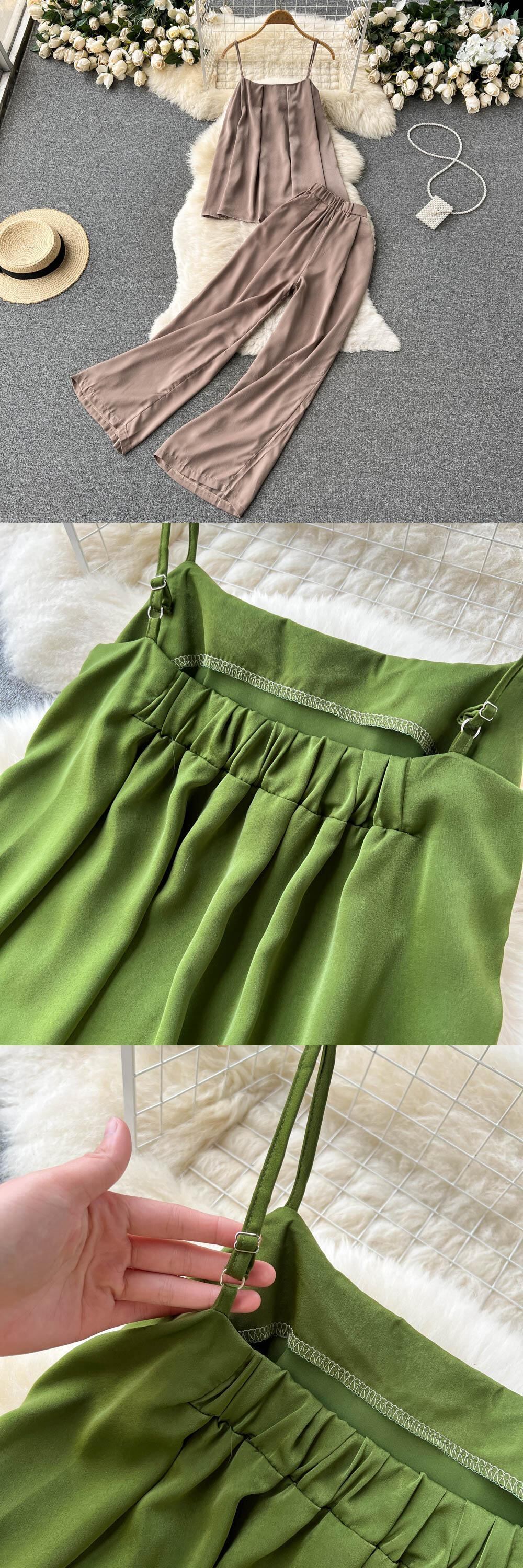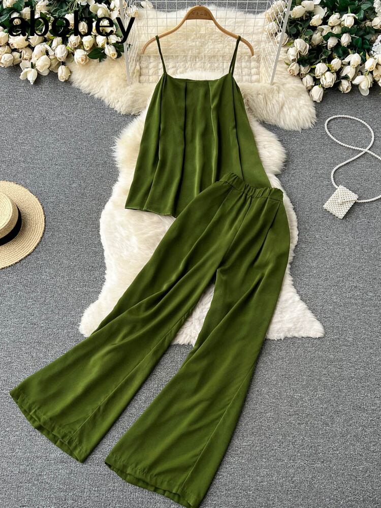 ソリッドツーピースセット女性夏セクシーオフショルダースリングトップスとワイドレッグパンツスーツ2022ルーズな衣装 サマー 夏物 ワイドパンツ ソリッドカラー Abe81058282598