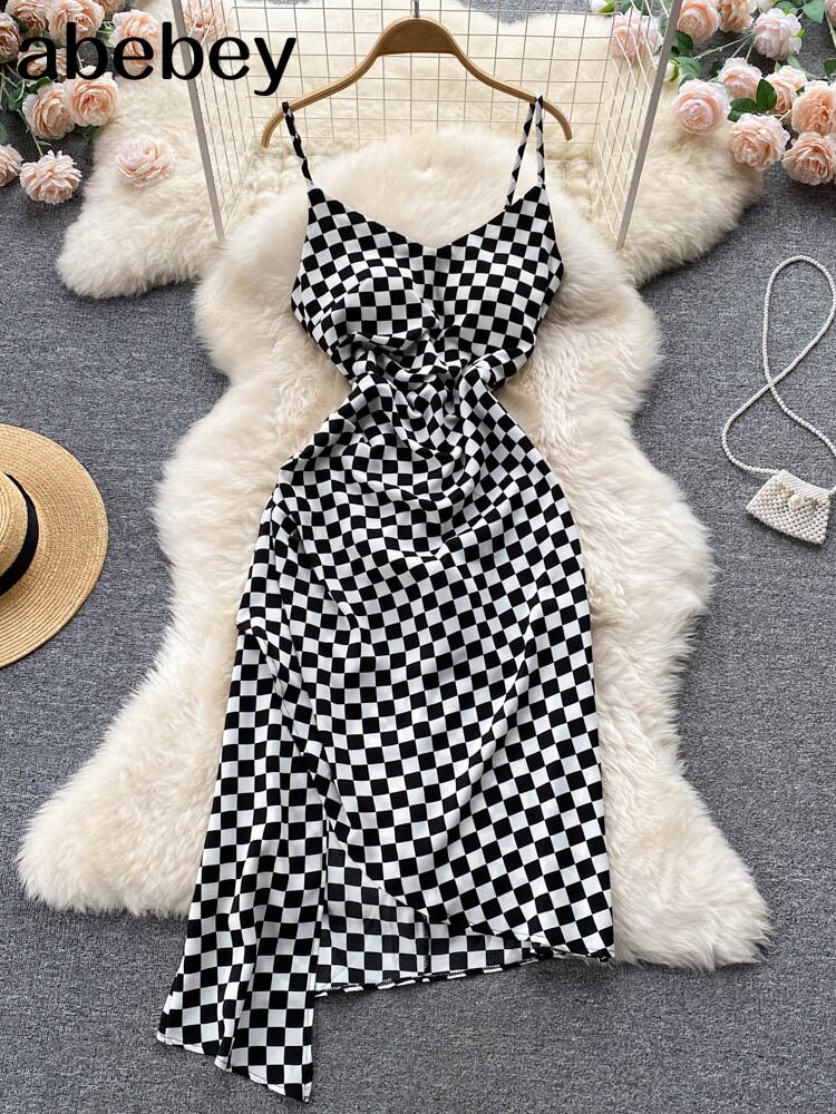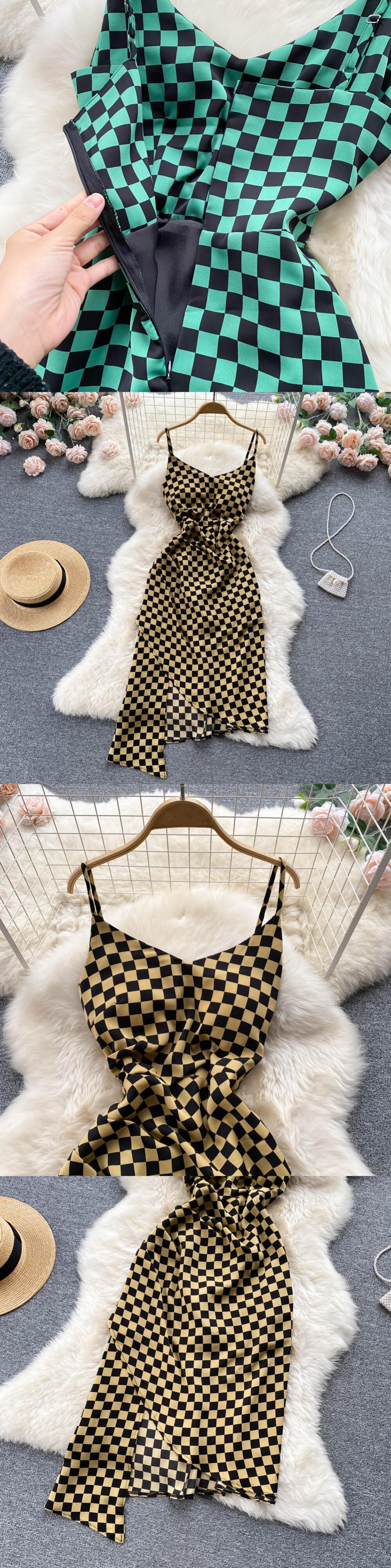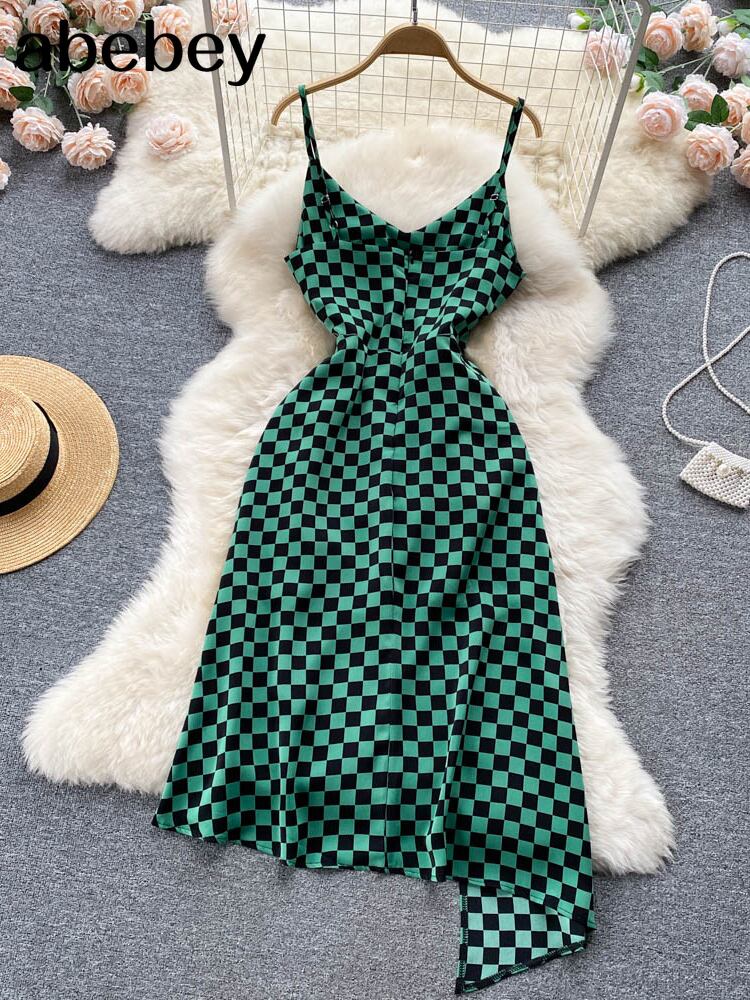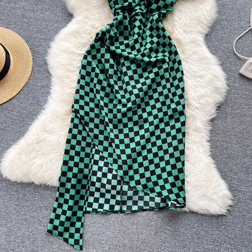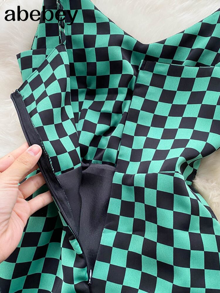 非対称チェック柄スリム女性ドレス新しい夏のフリルVネックスリングドレスホリデーミニドレス2022 サマー 夏物 Abe25504052467