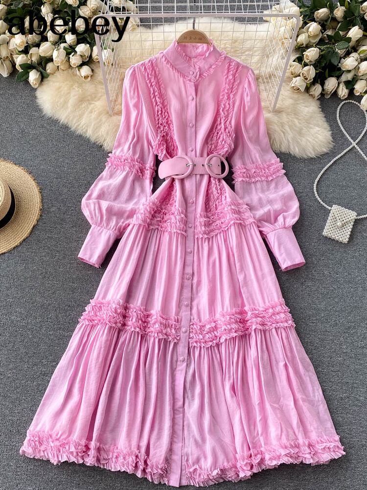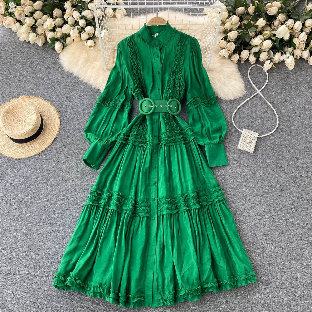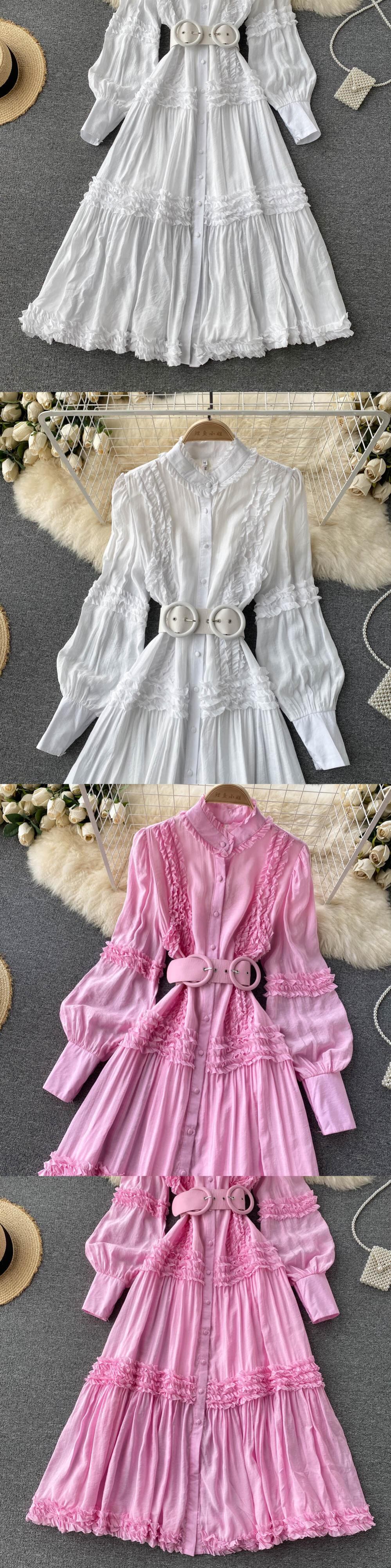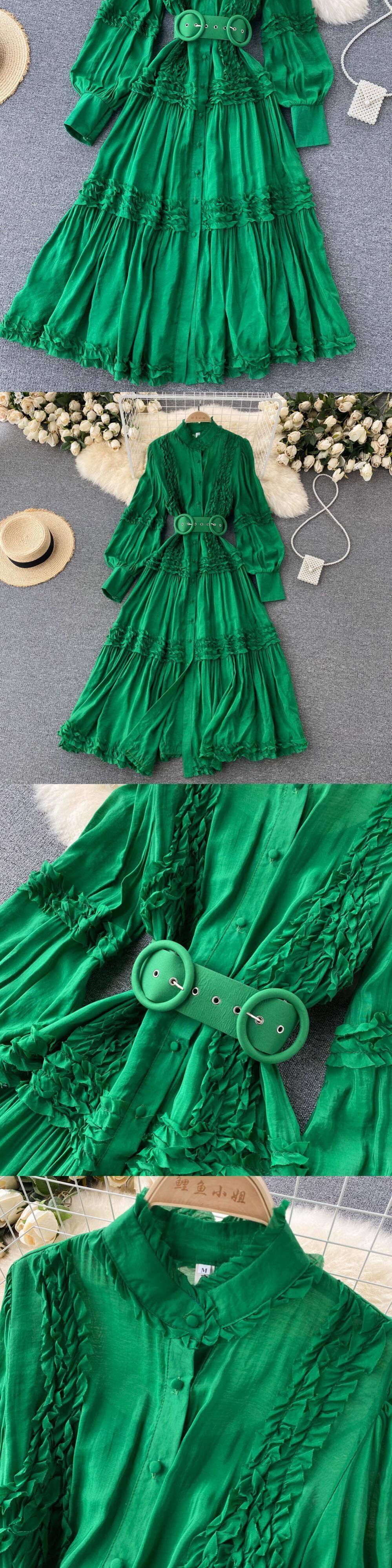 ソリッドドレス女性スタンドカラールーズロングスリーブサッシュレースアップウエストミディドレス 長袖 ソリッドカラー Abe44557986931