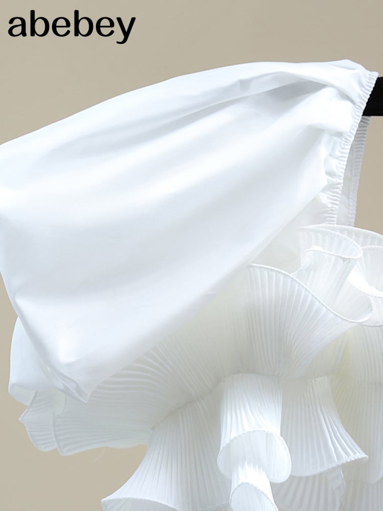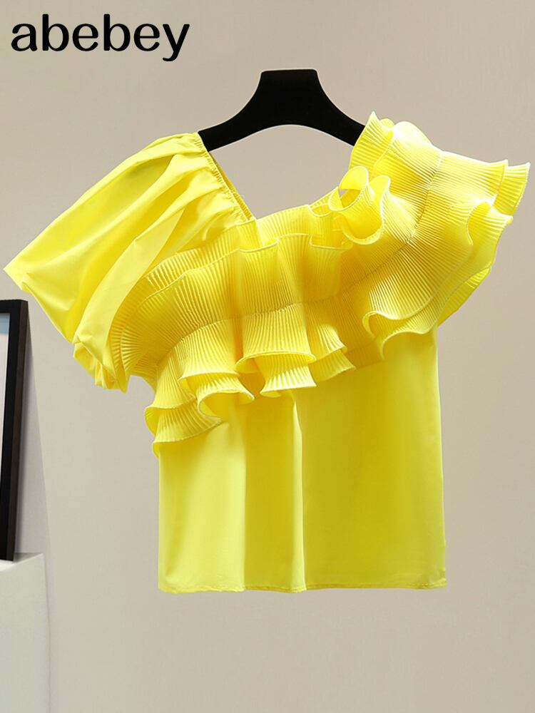 フリルトリムTシャツ女性不規則な襟パフスリーブソリッドルースTシャツサマースタイル2022 夏物 ソリッドカラー Abe79822870125