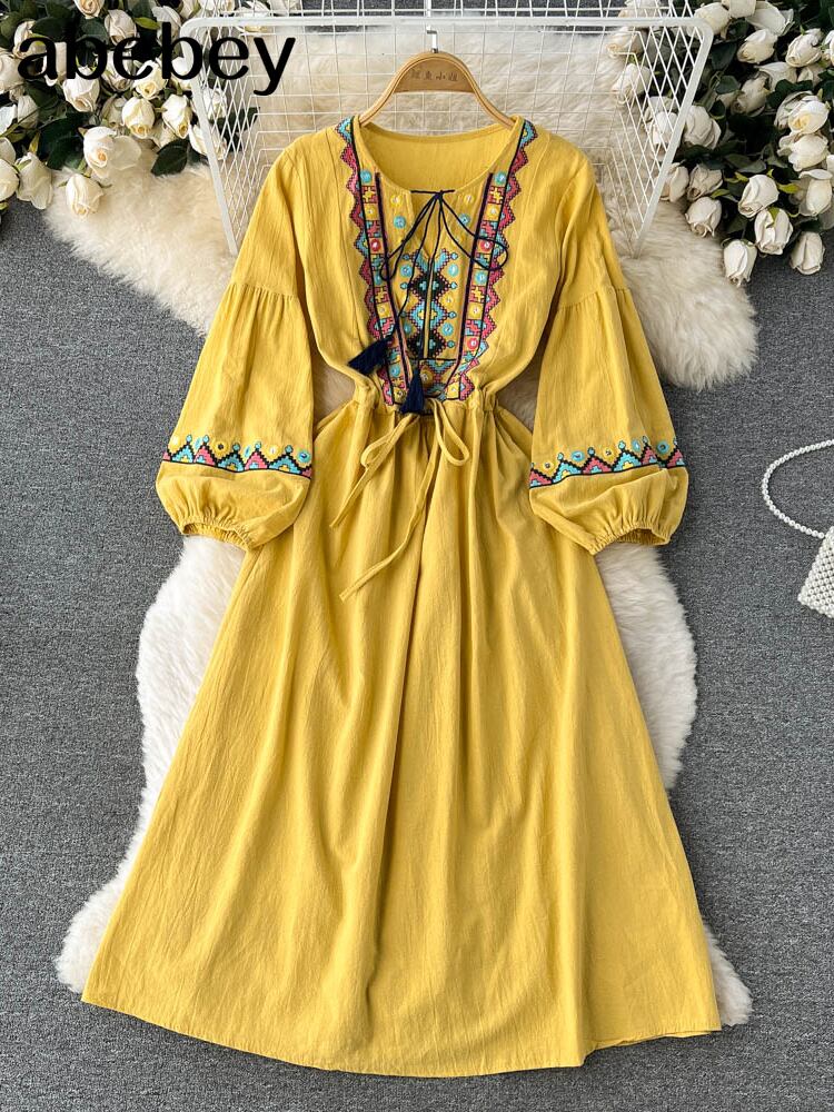 2022年女性レトロフレアスリーブビーチ刺繍チュニックドレス夏のVネック自由奔放に生きるホリデードレスゆるいVestidos サマー 夏物 Abe30415048472