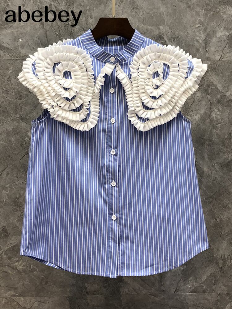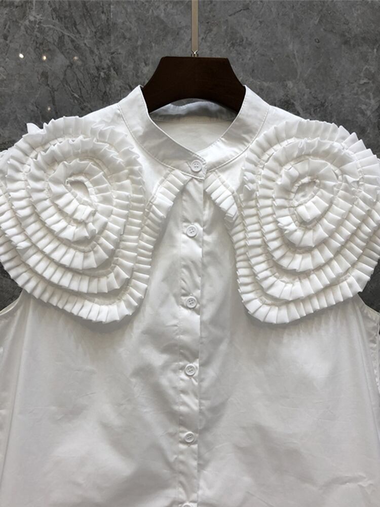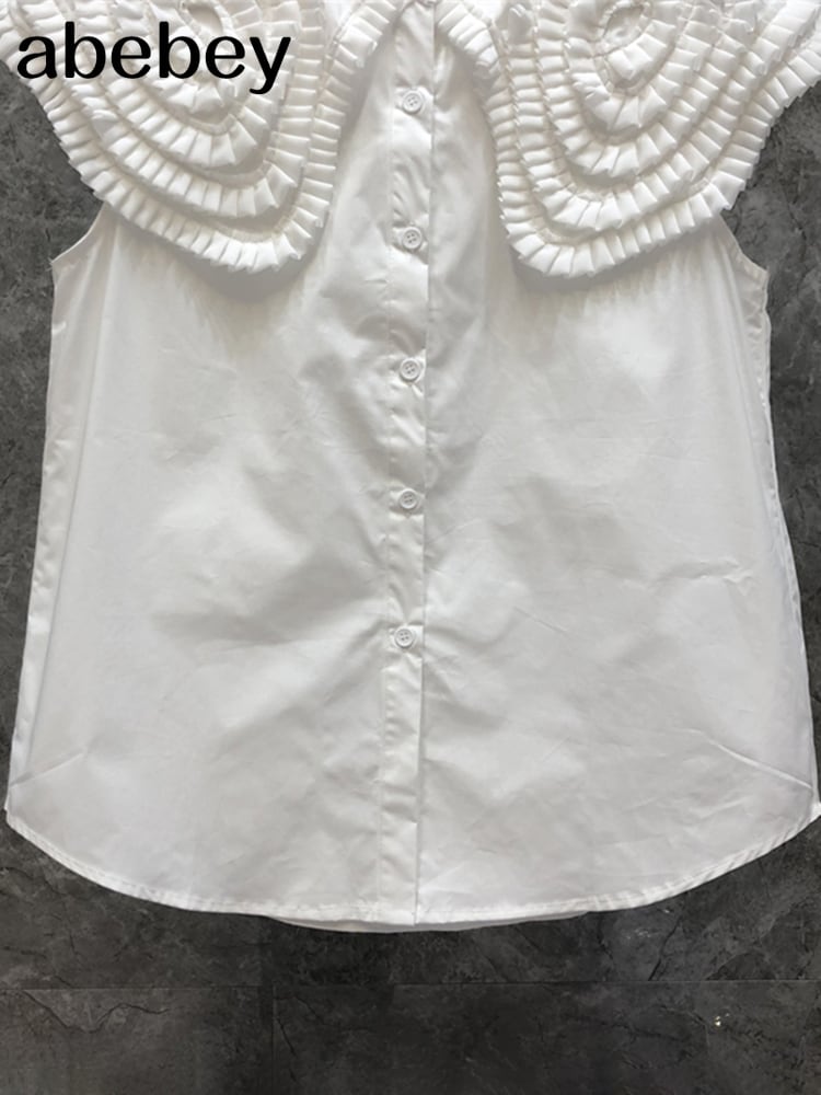 ホワイトフォールドプリーツシャツ女性ピーターパンカラーノースリーブソリッドミニマリストボタンブラウススタイル ソリッドカラー Abe89894738401