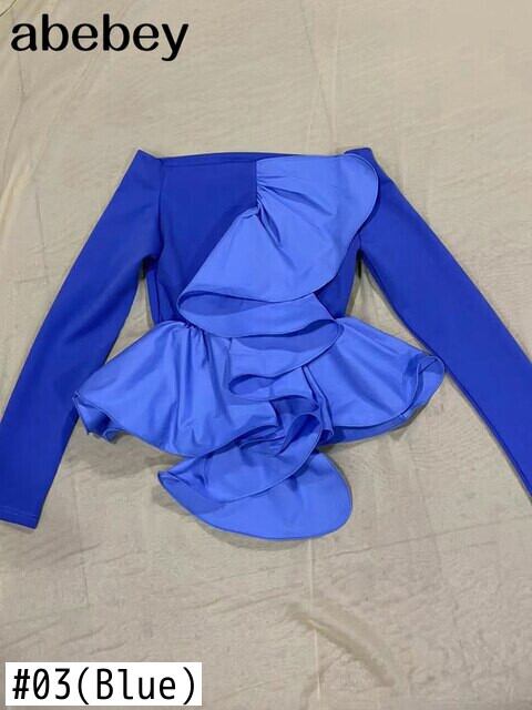 ルーズTシャツ女性スラッシュネック長袖オフショルダーパッチワークフリルトリムTシャツ ロング Abe69151491533