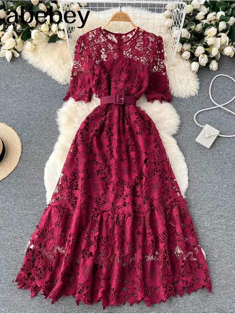 2022ランウェイレディースドレス半袖中空レースフラワースリムパーティーマキシドレスvestidosdefiesta ショート ハーフスリーブ フラワーデザイン Abe34384075643
