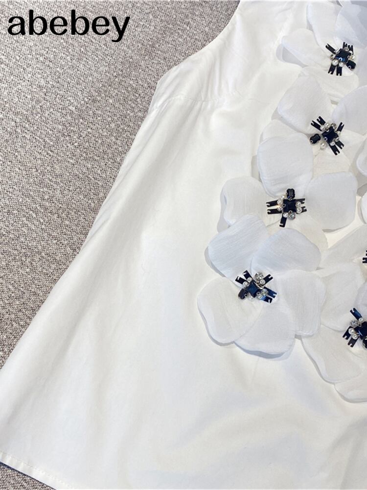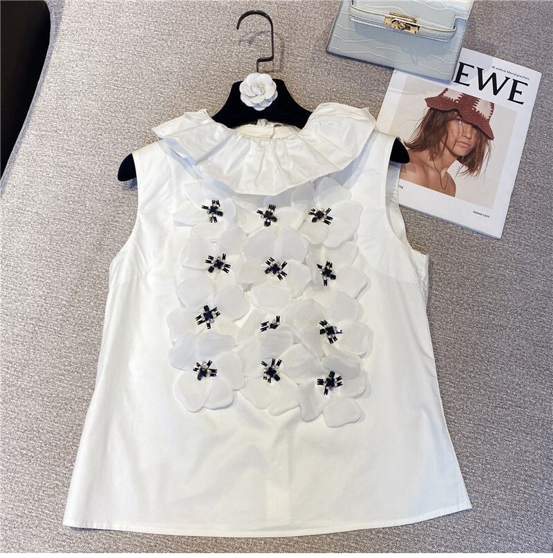 パッチワークフリルトリムブラウス女性ラウンドネックノースリーブアップリケベスト2022夏服 サマー 夏物 Oネック Abe41727685089