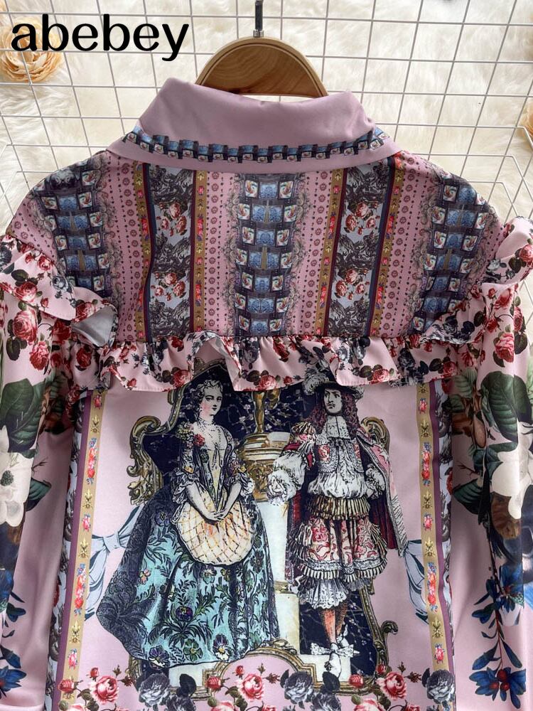 レディースパレスレトロプリントランタン長袖シャツ+ウエストスカートツーピースセット ロング レース Abe70364449927